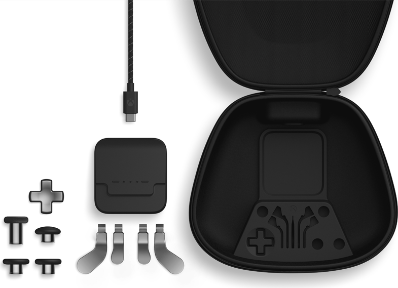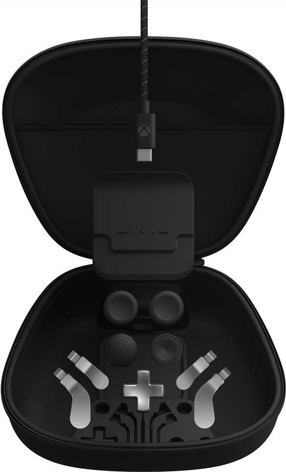 D-Pad (Standard), 2 klassische Thumbsticks, hoher Thumbstick, Thumbstick mit Kuppel, 2 mittelgroße Paddel, 2 Mini-Paddel, Schutzhülle, Ladestation, USB-C Kabel |
