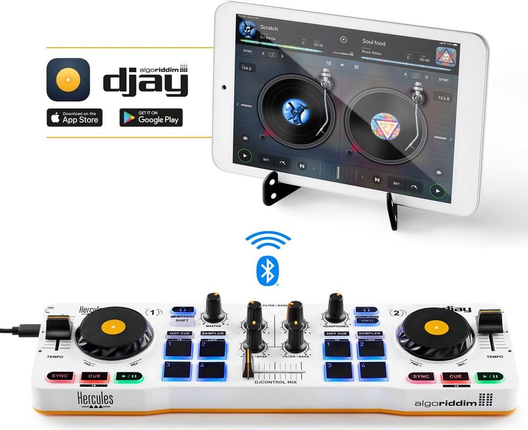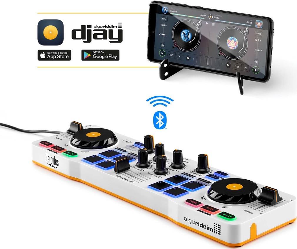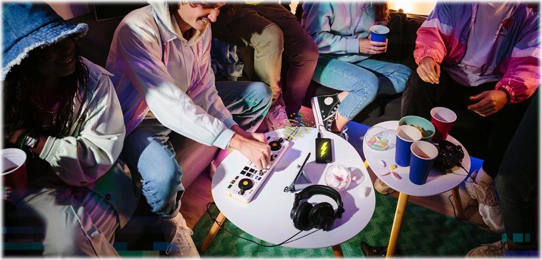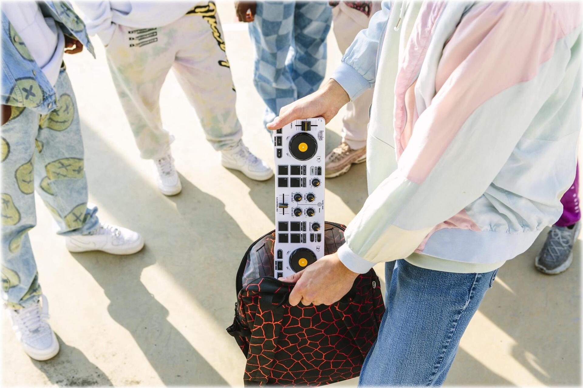 Der tragbare DJControl Mix passt in einen Rucksack und kann überallhin mitgenommen werden. Entfalten Sie Ihre Kreativität, legen Sie die angesagtesten Videos auf oder werden Sie zum Pop-up-DJ auf einer Hausparty im kleinen Kreis. Der DJControl Mix wird über eine externe Batterie oder ein USB-Netzteil mit Strom versorgt und lässt sich über Bluetooth mit der kostenlosen Algoriddim djay-App verbinden. Es ist kinderleicht, jederzeit und überall zu mixen!