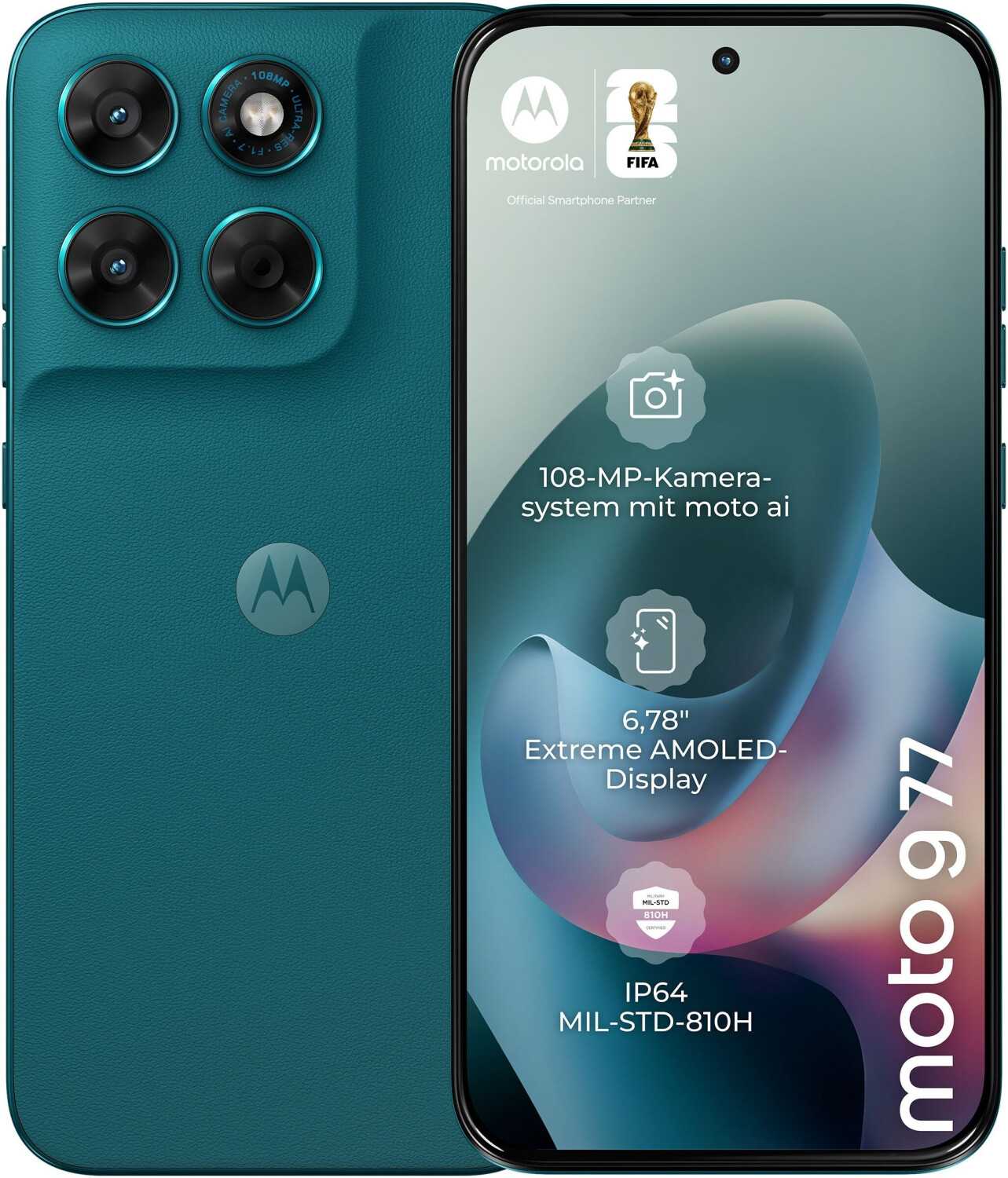 Das Motorola moto G77 in shaded spruce ist ein alltagstaugliches Android?Smartphone mit großem 256?GB?Speicher, solider Kameraausstattung und einem ausdauernden Akku. Das Gerät richtet sich an Nutzer, die ein zuverlässiges, flüssiges Smartphone mit viel Speicherplatz und einem eleganten Design suchen. Das Display bietet eine klare Darstellung für Streaming, Social Media und Apps, während der Snapdragon?Prozessor für stabile Performance sorgt.
