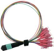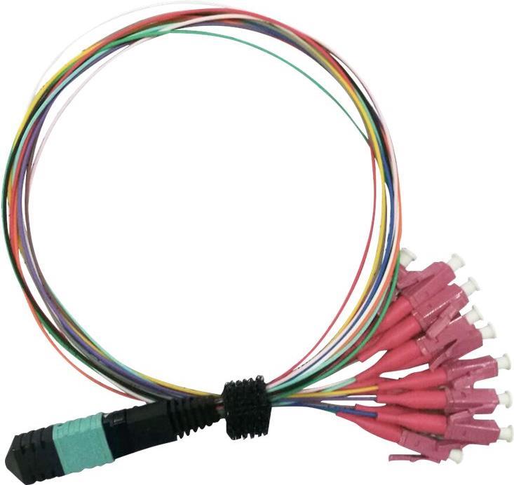 MPO (multi-fibre push-on) Verkabelungssystem - Diese Fan-Out-Kabel werden für die Verbindung eines MPO-Kabels zu 12 LC-Steckern genutzt. Das MPO (multi-fibre push-on) Verkabelungssystem ist eine einfach zu nutzende Lösung, basierend auf einem High-Density-Stecker und Flachband-Glasfaserkabeln mit 12 Fasern. Dieses System ist weit verbreitet in Rechenzentren, findet aber auch Anwendung z.B. zwischen Server-Räumen. Es wurde für eine zuverlässige und schnelle Handhabung entworfen und bietet die Vorteile eines geringen Platzbedarfs und höchster Skalierbarkeit. Die vorkonfektionierten MPO-Kabel können zu anderen Steckertypen ausgefächert werden, üblicherweise zu LC-Steckern, um damit die Verbindung zu Standard-LWL-Produkten oder -Diensten herzustellen. Dies geschieht über Module oder über sog. Fan-Out-Kabel. • Unterstützt alle Glasfaser-Anwendungen im Ethernet-Bereich • Modulare Lösung mit wiederverwendbaren Modulen und Kabeln • High-Density Verkabelung spart erheblich Platz und bietet dadurch verbesserte Luftströmung im Vergleich zu traditionellen Kabelbündeln • Kabel werden vorkonfektioniert und damit in gesicherter Qualität geliefert Wesentliche Fakten zu MPO MPO-Verbindungen bringen i.d.R. 12 Fasern in einem einzigen Stecker zusammen. Eine Verbindung muss fest sein und die Faserenden müssen sauber aneinandergereiht sein. Diese Anforderungen sind wesentlich, um die angestrebten Übertragungsparameter zu erreichen. Daher gibt es MPO-Stecker in einer \"männlichen\" Version (mit Stiften) oder in einer \"weiblichen\" Version (ohne Stifte). Die Stifte stellen sicher, dass die Vorderseiten der Stecker in der richtigen Position aufeinander treffen und damit auch die Faserenden exakt zusammengeführt werden. Es gibt verschiedene Methoden der Zuordnung der 12 Faserenden. Unsere Trunk-Kabel sind nach der Methode A (Pin 1 zu Pin 1) konfektioniert. Hinweise: Alle angebotenen Kabel sind halogenfrei (LS0H). Die Stecker sind Low-Loss-Stecker mit besonders geringer Einfügedämpfung.Produkttext[/head]Das MPO (multi-fibre push-on) Verkabelungssystem ist eine einfach zu nutzende Lösung, basierend auf einem High-Density-Stecker und Flachband-Glasfaserkabeln mit 12 Fasern. Dieses System ist weit verbreitet in Rechenzentren, findet aber auch Anwendung z.B. zwischen Server-Räumen. Es wurde für eine zuverlässige und schnelle Handhabung entworfen und bietet die Vorteile eines geringen Platzbedarfs und höchster Skalierbarkeit. Die vorkonfektionierten MPO-Kabel können zu anderen Steckertypen ausgefächert werden, üblicherweise zu LC-Steckern, um damit die Verbindung zu Standard-LWL-Produkten oder -Diensten herzustellen. Dies geschieht über Module oder über sog. Fan-Out-Kabel.[head]Hauptmerkmale