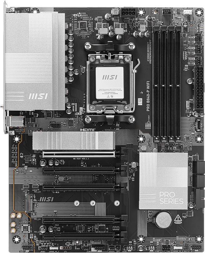 Das MSI PRO B840-P WIFI-Motherboard bietet eine robuste Grundlage für Hochleistungs-Computing und unterstützt Ryzen-Prozessoren der Serien 7000 bis 9000. Es ist mit vier 288-poligen DIMM-Steckplätzen für DDR5-SDRAM ausgestattet und unterstützt eine Vielzahl von RAM-Geschwindigkeiten bis zu 4000 MHz (Übertaktung), sodass Benutzer ihren Speicher an die Anforderungen ihrer Anwendungen anpassen können. Das Motherboard ist mit fortschrittlichen Netzwerkfunktionen ausgestattet, darunter 2,5-Gigabit-Ethernet und Wi-Fi 7, die Flexibilität für einen schnellen Internetzugang und eine nahtlose Verbindung mit Geräten über Bluetooth 5.4 bieten. Zusätzlich zu den starken Verarbeitungs- und Netzwerkfähigkeiten verfügt dieses Motherboard über eine Vielzahl von Erweiterungsoptionen mit mehreren PCIe-Steckplätzen und M.2-Sockeln, die eine Anpassung mit Grafikkarten und Speicherlösungen ermöglichen. Mehrere USB-Anschlüsse, darunter USB-C 3.2 Gen 2, gewährleisten die Kompatibilität mit einer Vielzahl von Peripheriegeräten. Die MSI ClickBIOS 5-Schnittstelle vereinfacht den Einrichtungs- und Konfigurationsprozess und ermöglicht es Benutzern, ihre Systeme einfach zu optimieren. Verbesserte Kühlfunktionen wie der M.2 Shield FROZR und ein erweitertes Kühlkörperdesign tragen dazu bei, die Leistung unter Last aufrechtzuerhalten, und machen das MSI PRO B840-P WIFI zu einer zuverlässigen Wahl sowohl für Gaming- als auch für Workstation-Setups.