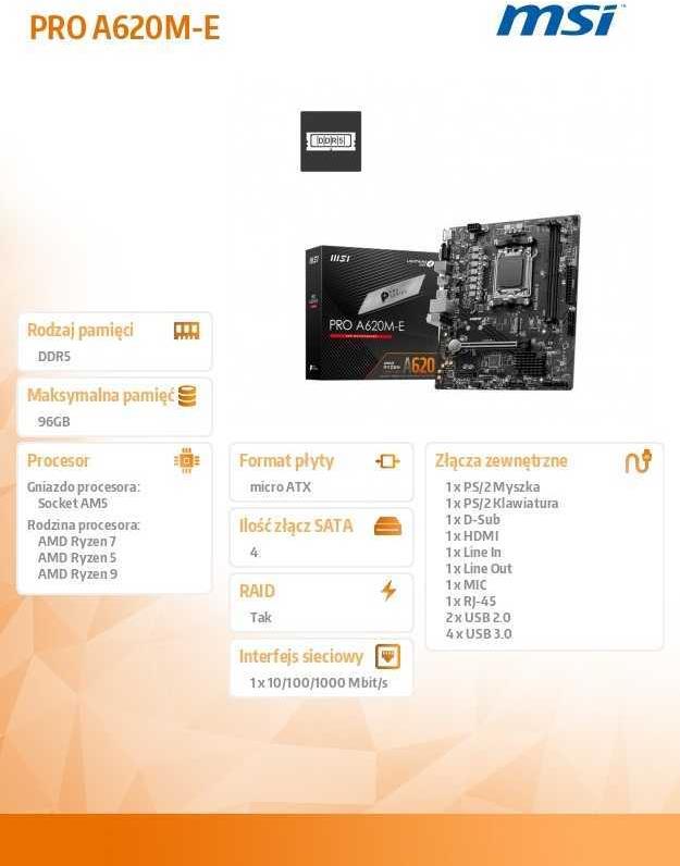 | Produktbeschreibung | MSI PRO A620M-E - Motherboard - micro ATX - Socket AM5 - AMD A620 |