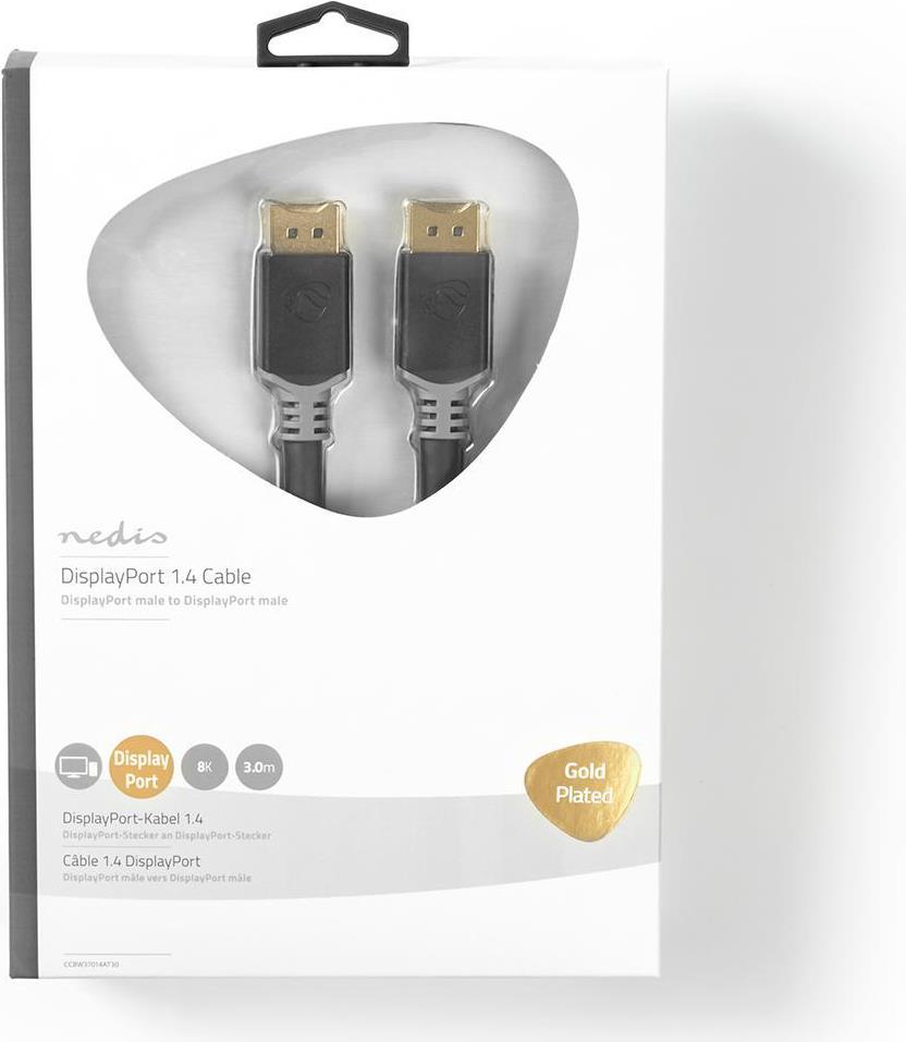 Nedis CCBW37014AT30. Kabellänge: 3 m, Anschluss 1: DisplayPort, Anschluss 2: DisplayPort. Kabeldurchmesser: 8,5 mm, Menge pro Packung: 1 Stück(e), Verpackungsbreite: 55 mm (CCBW37014AT30)