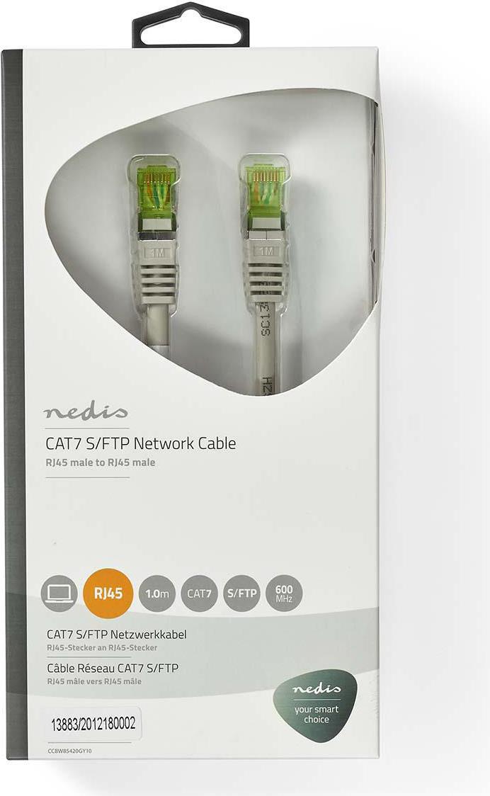 Nedis CCBW85420GY10. Kabellänge: 1 m, Kabelstandard:Cat.7 Rohkabel, Kabelschirmung: S/FTP (S-STP), Anschluss 1: RJ-45, Anschluss 2: RJ-45 (CCBW85420GY10)