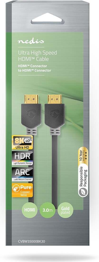 Nedis CVBW35000BK30. Kabellänge: 3 m, Anschluss 1: HDMI Typ A (Standard), Steckverbinder 1 Geschlecht: Männlich, Anschluss 2: HDMI Typ A (Standard), Steckverbinder 2 Geschlecht: Männlich, Beschichtung Steckerkontakte: Gold, Datenübertragungsrate: 48 Gbit/s, Audio Return Channel (ARC), Produktfarbe: Anthrazit (CVBW35000BK30)