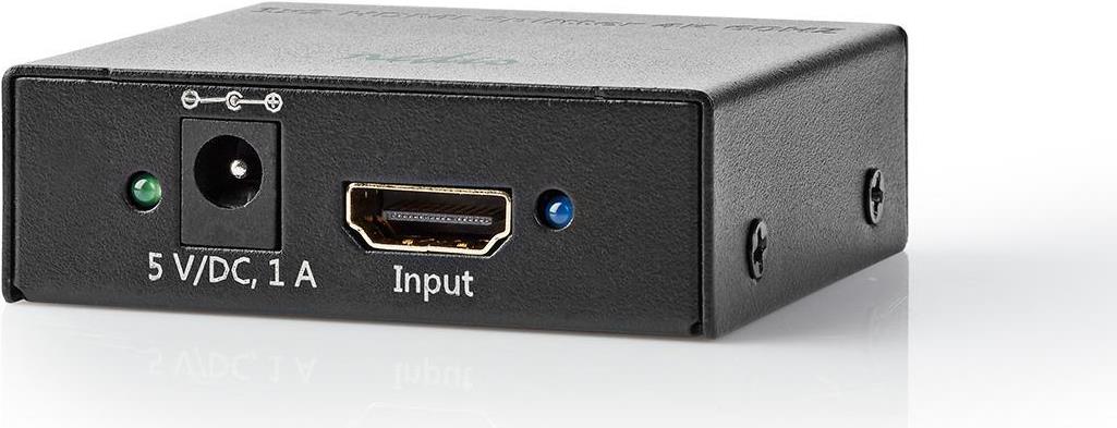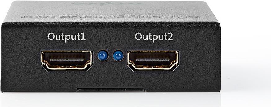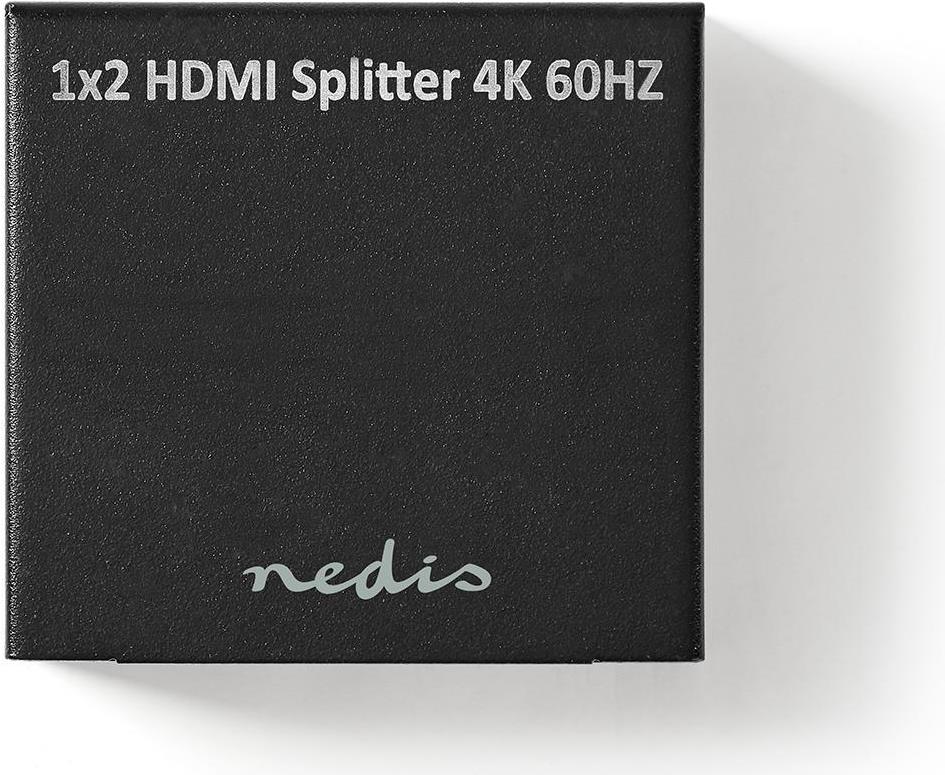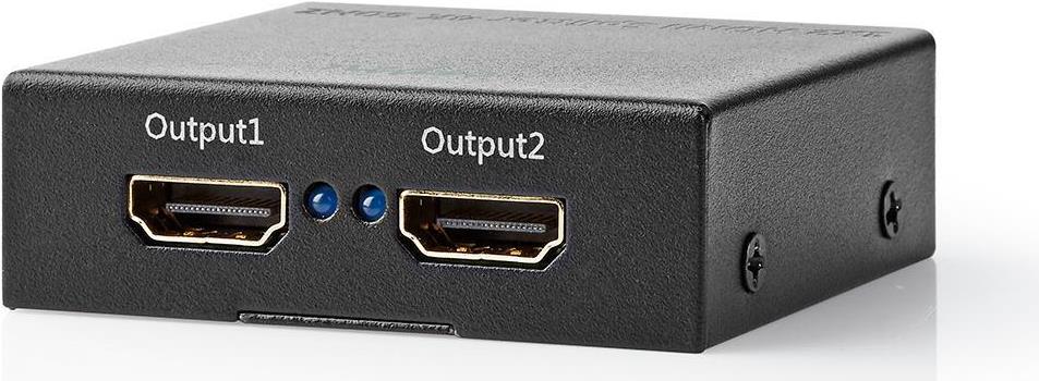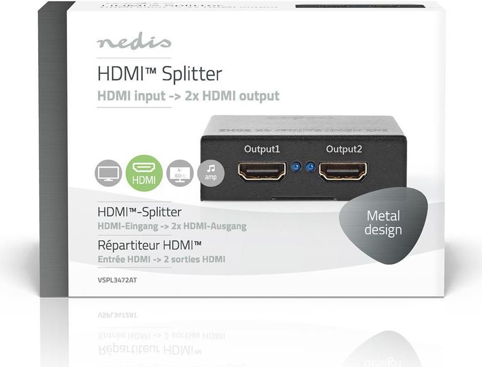 Nedis VSPL3472AT. Video Porttyp: HDMI, Teilnehmerausgang: 2x HDMI. Produktfarbe: Schwarz, Gehäusematerial: Metall, HD-Typ: 4K Ultra HD. AC Eingangsspannung: 5 V, Eingangsstrom: 1 A, Stromverbrauch (max.): 5 W. Breite: 60 mm, Tiefe: 70 mm, Höhe: 20 mm. Menge pro Packung: 1 Stück(e), Verpackungsart: Box (VSPL3472AT)