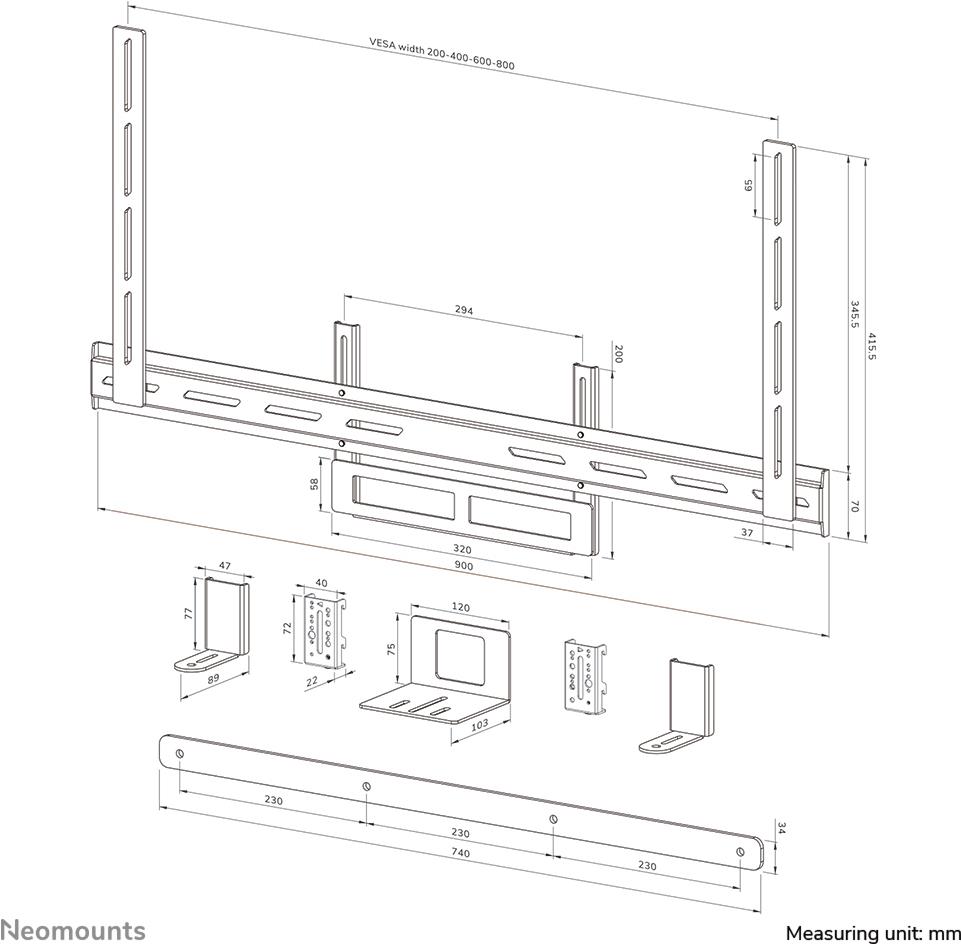 Das Neomounts AV2-500BL ist ein universelles Videobar-Kit für Bildschirme mit einer Mindestgröße von 43\" und einem VESA-Lochbild von 200x200 bis 800x600 mm. Das sehr robuste, stabile und vielseitige Kit hat eine maximale Gewichtskapazität von 10 kg und kann entweder über oder unter dem Bildschirm installiert werden. Für maximale Anpassungsfähigkeit können sowohl der Videobar-Träger als auch die Backplate-Halterungen unabhängig voneinander in der Höhe verstellt werden.Das Videobar-Kit AV2-500BL ist mit den meisten Videobars*, PTZ-Kameras und Soundbars, einschließlich Logitech Rally Plus-Lautsprechern, kompatibel. Um eine breite Anwendbarkeit zu gewährleisten, können die Montagelöcher in Breite und Höhe variieren. Der VESA-Rahmen ist sowohl in der Höhe als auch in der Breite verstellbar (200/400/600/800) und kann an der Wand, am Boden und sogar am Schreibtisch oder an der Decke angebracht werden. Trotz der zahlreichen Auswahlmöglichkeiten ist die Installation einfach und wird durch die Ausrichtung mit Hilfe eines Lineals unterstützt, das eine nahtlose Installation der Leinwand ermöglicht.* Das Neomounts AV2-500BL Videobar-Kit ist universell und eignet sich für jede Art von Videobar, unabhängig von Marke oder Modell, innerhalb der Reichweite der Halterung (siehe Zeichnung). Darüber hinaus ist das AV2-500BL für die folgenden spezifischen Videobars optimiert:- Bose Professional VB1 und VB-S- Neat Bar und Bar Pro- Poly Studio, Studio X70 und Studio X30- Jabra Panacast 50- Logitech Meetup, Rally Bar, Rally Bar Mini, Rally Bar Huddle und Rally Plus- Cisco Webex Raum-Kit Plus- Yealink MSpeaker II, MeetingBar A30, MeetingEye 400 und MeetingEye 600Informationen zur Kompatibilität mit bestimmten Modellen oder Montagegrößen finden Sie im Online-Handbuch.Beschreibung