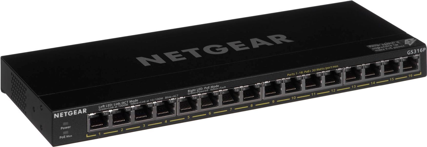 Netgear GS316P Unmanaged Gigabit Ethernet (10/100/1000) Schwarz Power over Ethernet (PoE) (GS316P-100PES)