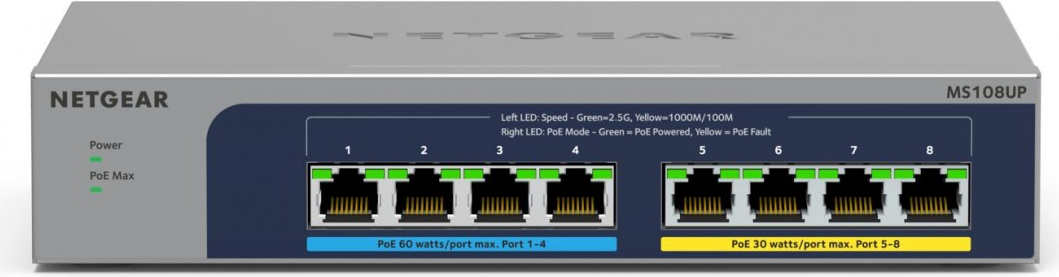 Der NETGEAR Multi-Gigabit Plus Switch (MS108EUP) bietet 8 Ports 1G/2,5G mit 4 PoE+-Ports und 4 Ultra60 PoE++-Ports, was ihn zu einem perfekten Switch für WiFi 6 AP-Konnektivität, Überwachung und mehr macht.