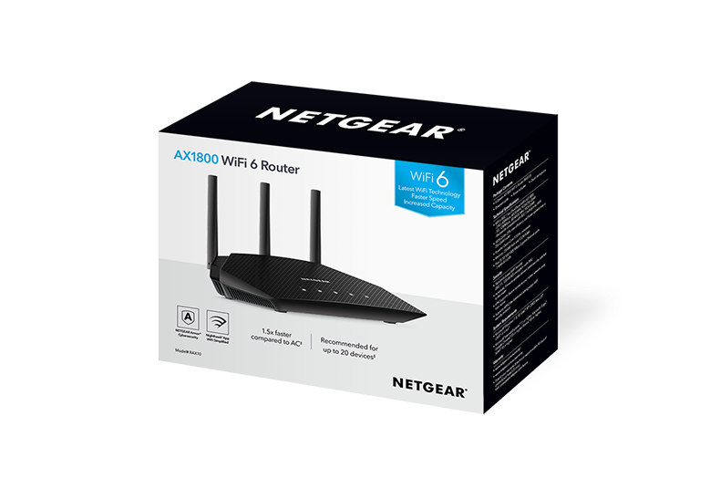 Der NETGEAR 4-Stream AX1800 WLAN-Router unterstützt die WiFi 6 Technologie, um allen angeschlossenen Geräten eine höhere Netzwerkkapazität mit durchgängiger und starker Signalstärke zu bieten. Der NETGEAR AX1800 WLAN-Router bietet eine neue Stufe der Gigabit-WLAN-Konnektivität, sodass Sie schneller Verbindungen herstellen, streamen und Downloads auf neuere mobile Geräte ausführen können. Der leistungsstarke Quad-Core Prozessor steigert die Gesamtleistung des Netzwerks.