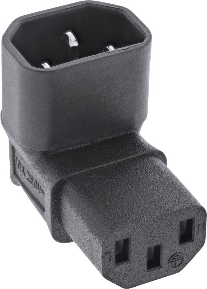 Strom Netzadapter für Kaltgeräte gemäß Norm IEC 60320• Buchse IEC 60320 Typ C14 zu Stecker IEC 60320 Typ C13• 90° oben/unten gewinkelte Version• 3-polige Belegung• Stromstärke max. 10A• Farbe: schwarz