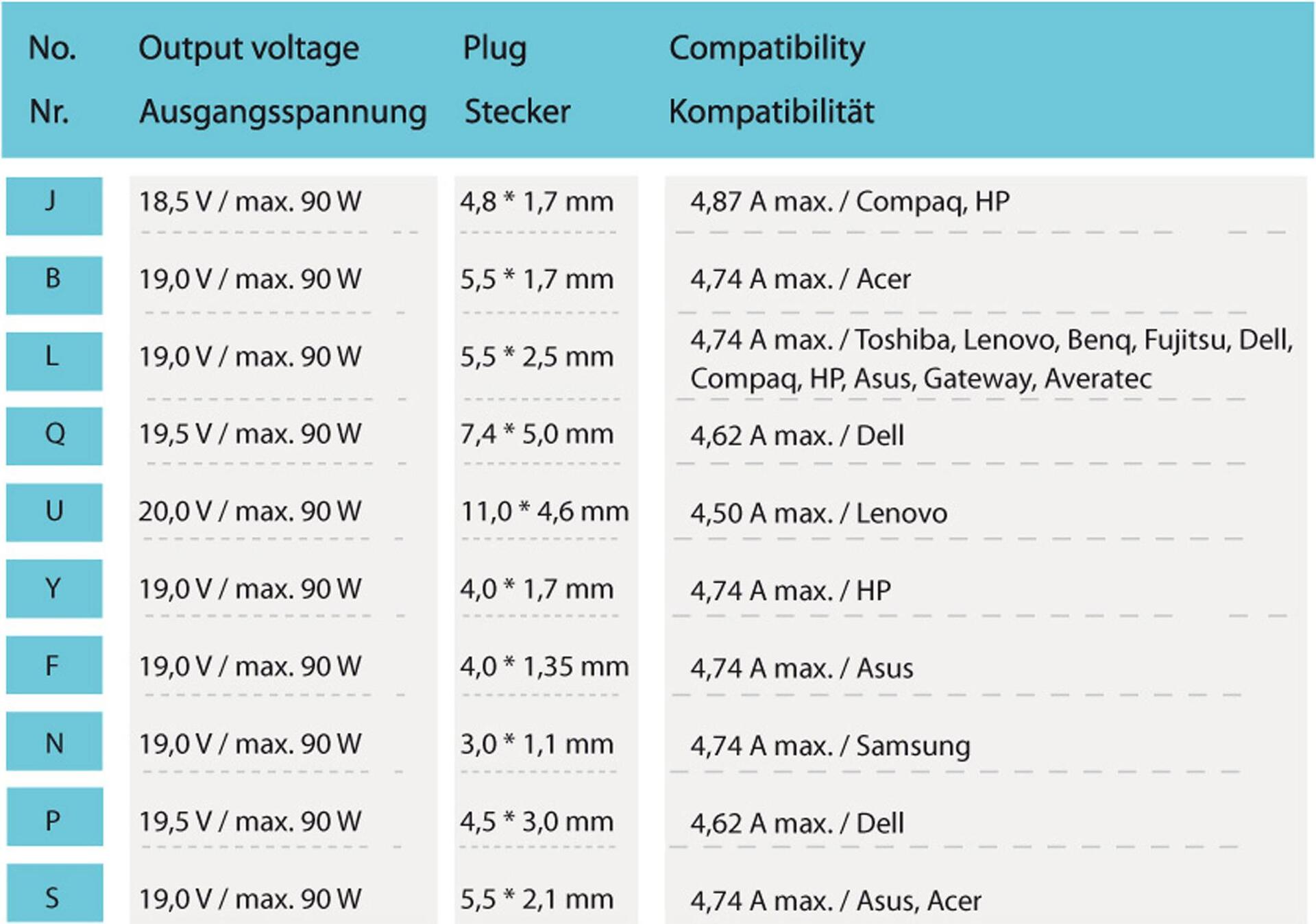 | Angaben zu Ausgangsleistungsanschlüssen | 1 x Gleichstromstecker 4,8 mm (ID: 1,7 mm) - 18.5 V 4.87 A 90 W 1 x Gleichstromstecker 5,5 mm (ID: 1,7 mm) - 19 V 4.74 A 90 W 1 x Gleichstromstecker 5,5 mm (ID: 2,5 mm) - 19 V 4.74 A 90 W 1 x Gleichstromstecker 7,4 mm (ID: 5,0 mm) - 19.5 V 4.62 A 90 W 1 x DC-Stromanschluss 11 x 4,6 mm - 20 V 4.5 A 90 W 1 x Gleichstromstecker 4,0 mm (ID: 1,7 mm) - 19 V 4.74 A 90 W 1 x Gleichstromstecker 4,0 mm (ID: 1,35 mm) - 19 V 4.74 A 90 W 1 x Gleichstromstecker 3.0 mm (ID: 1,1 mm) - 19 V 4.74 A 90 W 1 x Gleichstromstecker 4,5 mm (ID: 3.0 mm) - 19.5 V 4.62 A 90 W 1 x Gleichstromstecker 5,5 mm (ID: 2,1 mm) - 19 V 4.74 A 90 W |