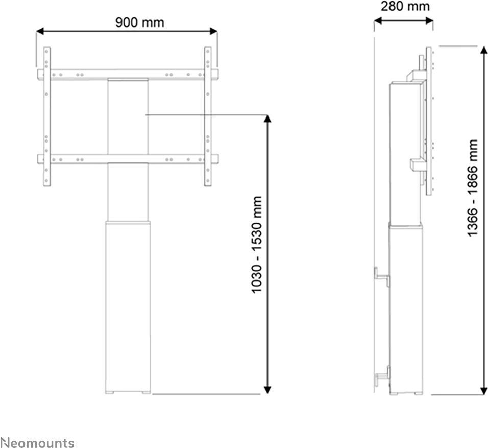 Das Neomounts Modell PLASMA-W2250 ist ein elektrisch höhenverstellbarer Bodenständer für Displays und TVs von 42\"-100\".Mit dem Neomounts PLASMA-W2250 Wandlift mit elektrischer Höhenverstellung können Sie ein Großformatdisplay oder TV auf dem Boden stellen und an der Wand befestigen. Der Wandabstand beträgt 7 cm. Positionieren Sie Ihr Gerät im Handumdrehen für das stehende oder sitzende Publikum und für jede Anwendung überall in Ihrem Gebäude. Ideal für Touch-Screen-Applikationen und den Einsatz im Klassenzimmer, Meetingraum, Präsentationsraum oder im Eingangsbereich.Der PLASMA-W2250 eignet sich für Bildschirme von 42\"-100\" und hat eine Tragfähigkeit von 130 kg.Die Höhe des Bildschirms lässt sich bequem um 50 cm mit der Fernbedienung verstellen. Vom Boden bis zum Zentrum ist der Abstand des Bildschirms von 105 cm bis 155 cm verstellbar. Die Position kann bequem mit 4 Stützen am Fuss unter der Zentralsäule justiert werden.