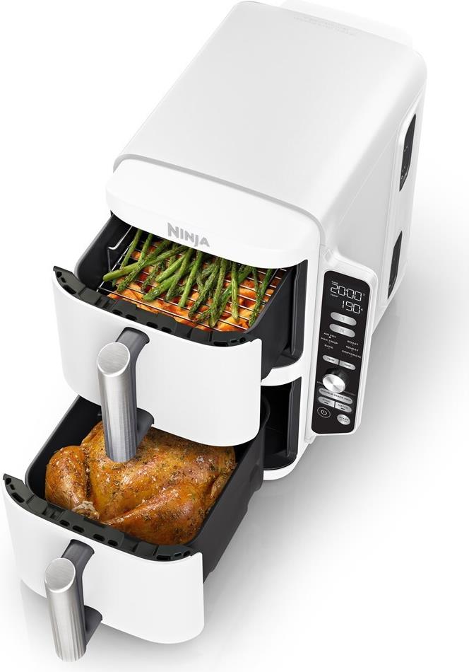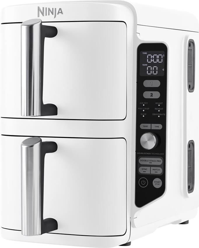 Die Ninja DoubleStack Heißluftfritteuse bietet mit ihrem Fassungsvermögen von 9,5 Litern vielseitige Zubereitungsmöglichkeiten und ermöglicht die Zubereitung von Mahlzeiten für bis zu 8 Personen. Mit einer Leistungsaufnahme von 2,47 kW ist dieses Gerät auf Effizienz und Effektivität ausgelegt und verfügt über ein digitales Display für eine einfache Navigation. Das einzigartige Design umfasst 2 herausnehmbare Körbe, sodass mehrere Komponenten einer Mahlzeit gleichzeitig zubereitet werden können. Ob zum Aufwärmen von Resten, Backen, Heißluftfrittieren oder Braten von Gemüse – mit 6 verfügbaren Programmen stehen Ihnen eine Vielzahl von Zubereitungsmöglichkeiten zur Verfügung. Die Antihaftbeschichtung sorgt für eine einfache Reinigung, während die herausnehmbaren Teile für zusätzlichen Komfort spülmaschinenfest sind. Für alle, die Wert auf gesundes Kochen legen, ist diese Heißluftfritteuse mit einem Temperaturbereich von 40 °C bis 240 °C und der Möglichkeit zum Dehydrieren eine wertvolle Ergänzung für jede Küche.