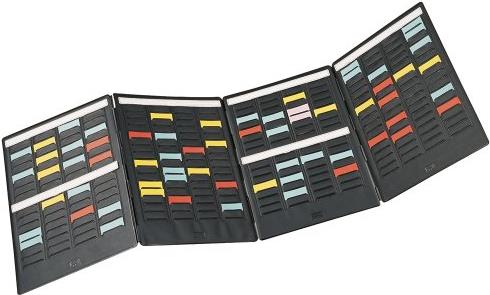 T-Karten-Systeme sind geeignet für Planung und Nachverfolgung. Sei es wöchentliche, jährliche oder spezielle Projektplanung, das System ist so flexibel wie Sie wünschen! Wenn Sie sich für den Planungszeitraum entschieden haben, benutzen Sie Titelstreifen und Indexstreifen um Zeiten, Termine, Projektnamen etc. festzulegen. Mit den T-Karten halten Sie Informationen fest, der "T"-Kopf der Karte dient dabei als Titelzeile, die restliche Fläche ist für Notizen. Nachverfolgen können Sie zum Beispiel Bemusterungen, Werkzeugverleih, Ausstellungsmaterial, Car Pools, Raumplanung … die Liste lässt sich beliebig fortsetzen! Mit den Mini-Planern können Sie Ihre Projekte und Termine einfach mitnehmen.