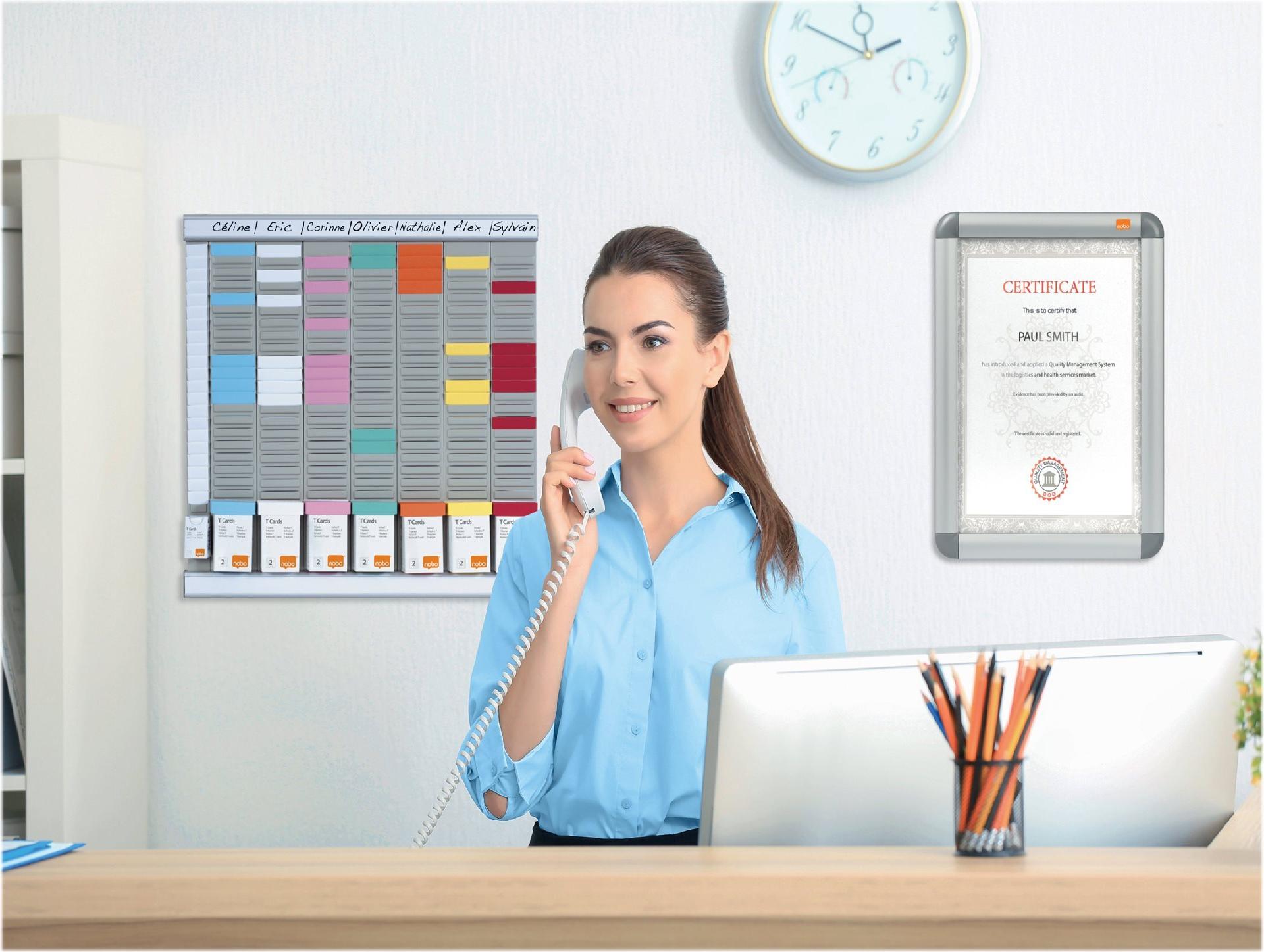 Mit dem Nobo T-Karten-Planungssystem behalten Sie Projekte und Ressourcen im Griff. Und damit das System genau Ihren Anforderungen entspricht, können Sie Ihr eigenes kreieren - je nach Aufgaben und Events, die Sie organisieren wollen. Für Ihr individuelles Planungssystem können Kartenträger und Rahmenprofile einzeln zusammengestellt werden. Wählen Sie die passende Größe der Rahmenprofile basierend auf der Breite aller nebeneinander montierten Kartenträger. Mit den Profilen können Sie Ihren T-Kartenträger oben und unten sichern. Die Planungsmodule rasten in die Schienen ein. Sie werden paarweise geliefert. Aus eloxiertem Aluminium. 2 Titelstreifen sind im Lieferumfang enthalten. Farbe: Silber. Größe 15.