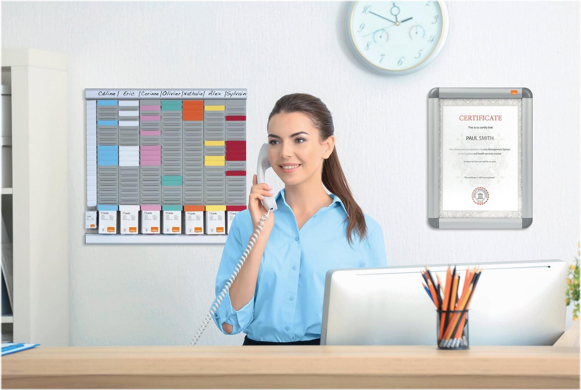 Mit dem Nobo T-Karten-Planungssystem behalten Sie Projekte und Ressourcen im Griff. Und damit das System genau Ihren Anforderungen entspricht, können Sie Ihr eigenes kreieren - je nach Aufgaben und Events, die Sie organisieren wollen. Für Ihr individuelles Planungssystem können Kartenträger und Rahmenprofile einzeln zusammengestellt werden. Wählen Sie die passende Größe der Rahmenprofile basierend auf der Breite aller nebeneinander montierten Kartenträger. Mit den Profilen können Sie Ihren T-Kartenträger oben und unten sichern. Die Planungsmodule rasten in die Schienen ein. Sie werden paarweise geliefert. Aus eloxiertem Aluminium. 2 Titelstreifen sind im Lieferumfang enthalten. Farbe: Silber. Größe 24.