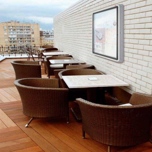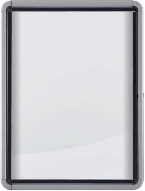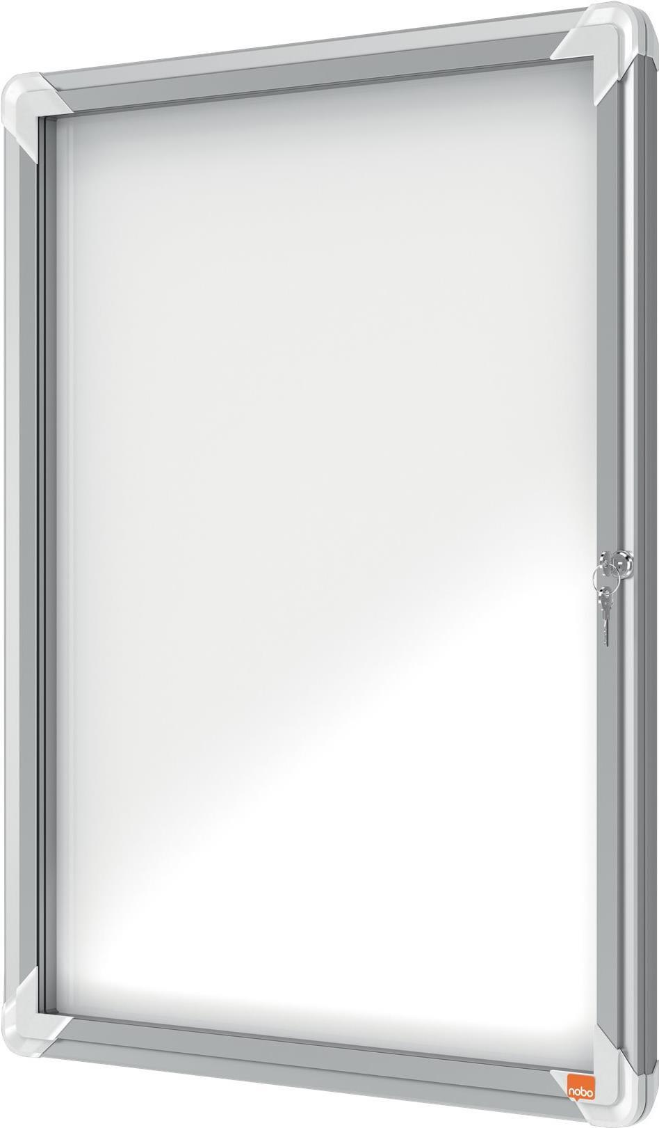 Wetterfester Schaukasten für die Wandmontage im Außenbereich mit magnetischer Rückwand, Klapptür aus 4-mm-Sicherheitsglas und Sicherheitsschloss. Der Schaukasten wird von einem modernen Aluminiumrahmen eingefasst und mittels der mitgelieferten Wandbefestigung angebracht. Die weiße, magnetische Metalloberfläche ist trocken abwischbar und eignet sich bestens zum Anheften und Präsentieren von Dokumenten. Größe: 4 x A4.