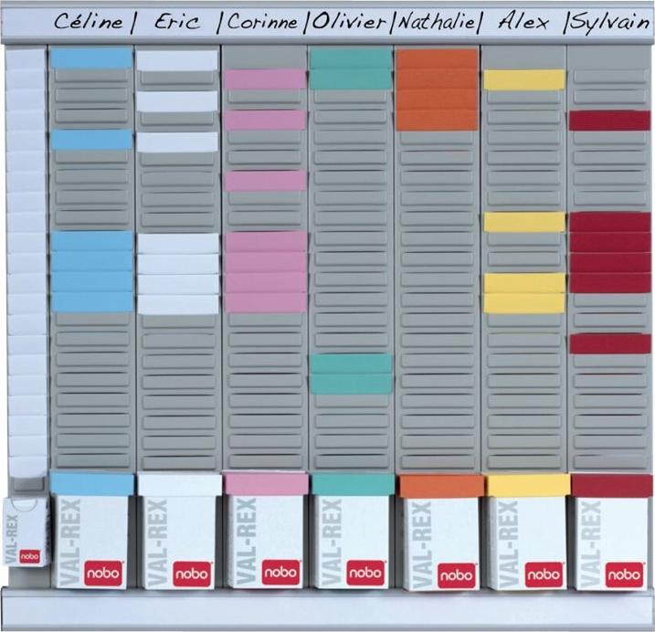 T-Karten-Systeme sind geeignet für Planung und Nachverfolgung. Sei es wöchentliche, jährliche oder spezielle Projektplanung, das System ist so flexibel wie Sie wünschen! Wenn Sie sich für den Planungszeitraum entschieden haben, benutzen Sie Titelstreifen und Indexstreifen um Zeiten, Termine, Projektnamen etc. festzulegen. Mit den T-Karten halten Sie Informationen fest, der "T"-Kopf der Karte dient dabei als Titelzeile, die restliche Fläche ist für Notizen. Nachverfolgen können Sie zum Beispiel Bemusterungen, Werkzeugverleih, Ausstellungsmaterial, Car Pools, Raumplanung … die Liste lässt sich beliebig fortsetzen! Dieses T-Karten-Set eignet sich ideal, um Besuche oder Meetings zu organisieren. Es enthält sieben Kartenträger mit je 24 Schlitzen für T-Karten Größe 2, 7 farbige T-Kartensets mit je 100 Stück für T-Karten Größe 2, 100 weiße T-Karten Größe 1, Wandbefestigungsset, 2 Aluminiumprofile mit 4 Paar Titelstreifen und 1 Indexspalte mit 24 Schlitzen für Karten Größe 1.