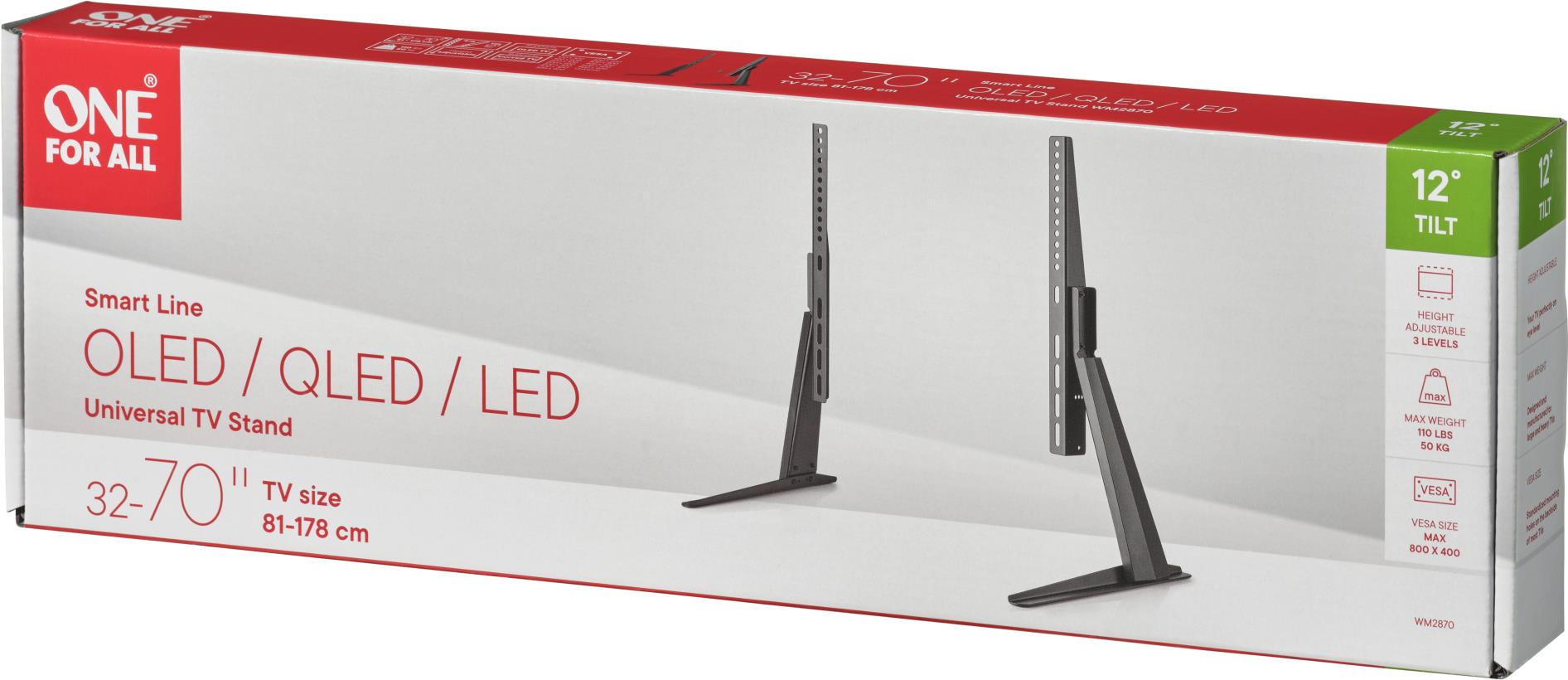 One For All Ultra Slim Line WM 2870. Höchstgewichtskapazität: 50 kg, Minimum Bildschirmgröße: 81,3 cm (32"), Maximale Bildschirmgröße: 177,8 cm (70"), Minimale VESA-Halterung: 100 x 100 mm, Maximale VESA-Halterung: 800 x 400 mm. Neigungswinkelbereich: -12 - 12°. Produktfarbe: Schwarz (WM2870)