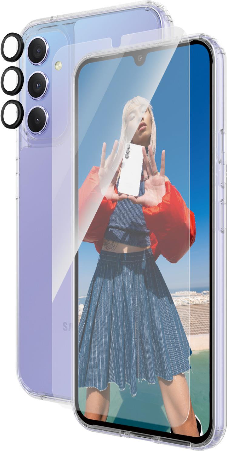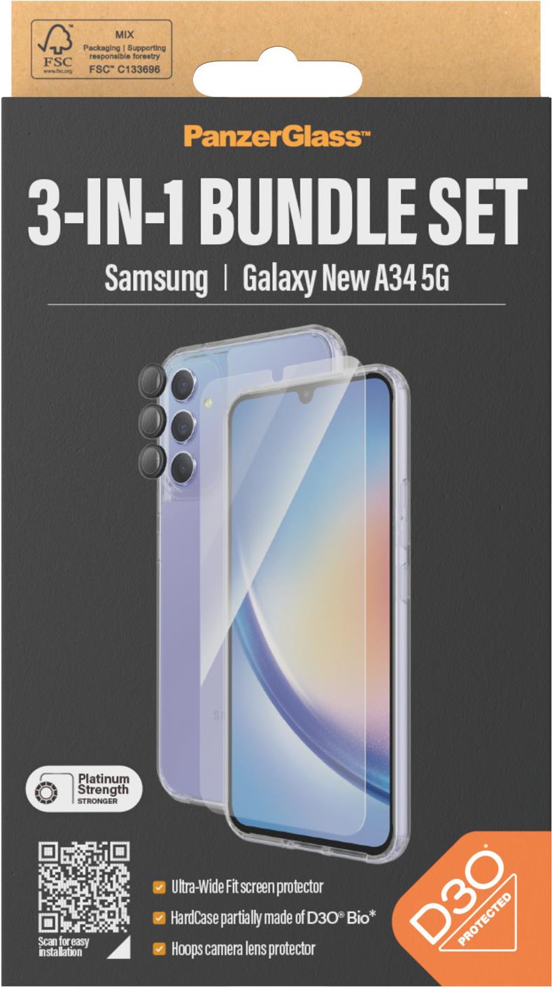 PanzerGlass ® 3-in-1 Schutz Set Samsung Galaxy New A34 5G | Ultra-Wide Fit. Markenkompatibilität: Samsung, Kompatibilität: Samsung - Galaxy new A34 5G. Trockene Anwendung. Schutzfunktion: Kratzresistent, Schockresistent. Material: Polyethylenterephthalat, Gehärtetes Glas, Produktfarbe: Transparent. Menge pro Packung: 1 Stück(e) (B0469+7357)