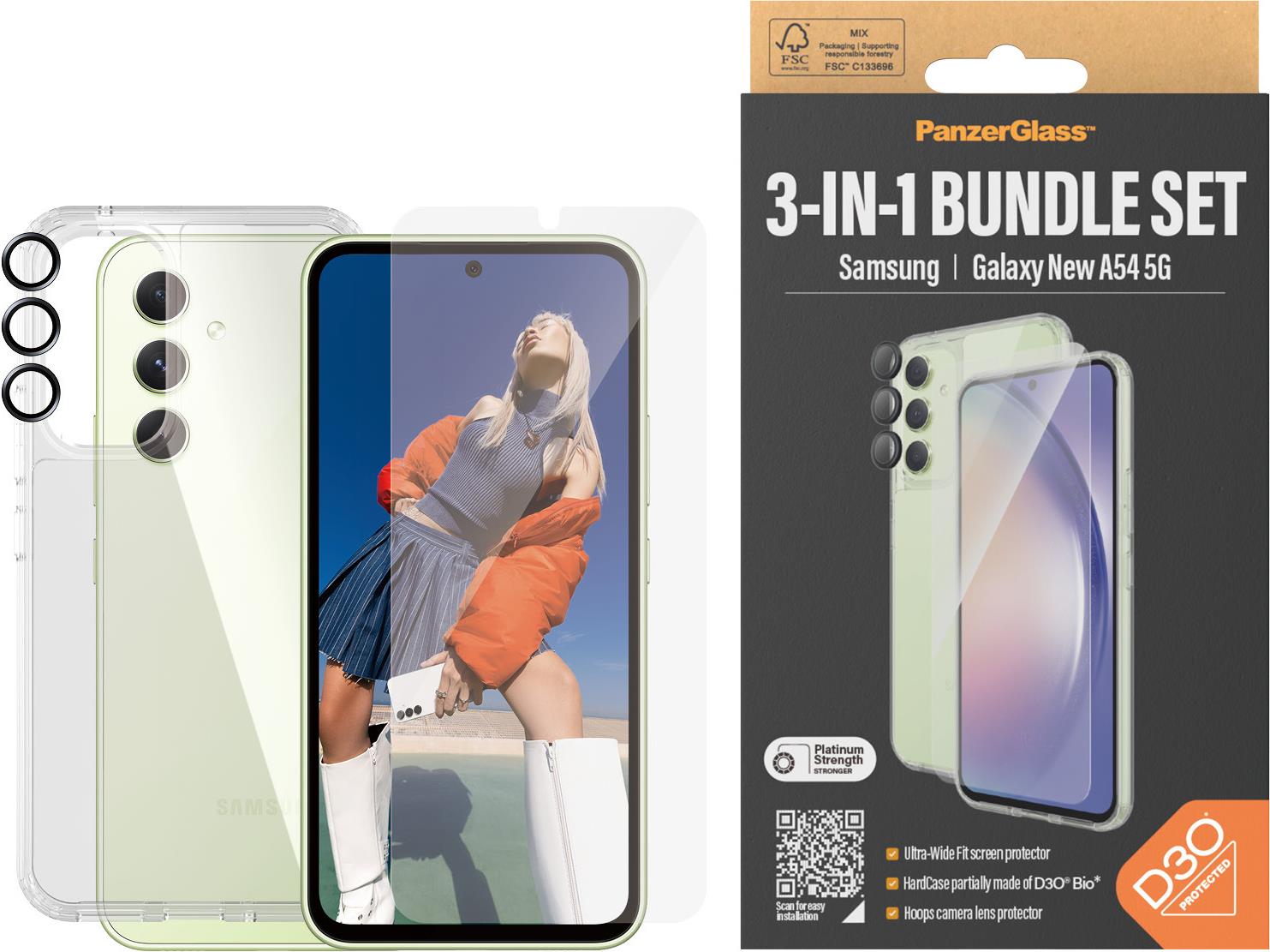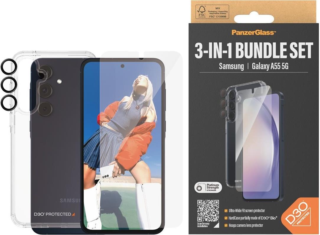 PanzerGlass - 3-in-1 Schutzpacket - hintere Abdeckung für Mobiltelefon - ultraweite Passform mit EasyAligner - D3O Bio, 100 % recycelter Kunststoff - mit Bildschirmschutz und Objektivschutz - für Samsung Galaxy A55 (B0470+7358)