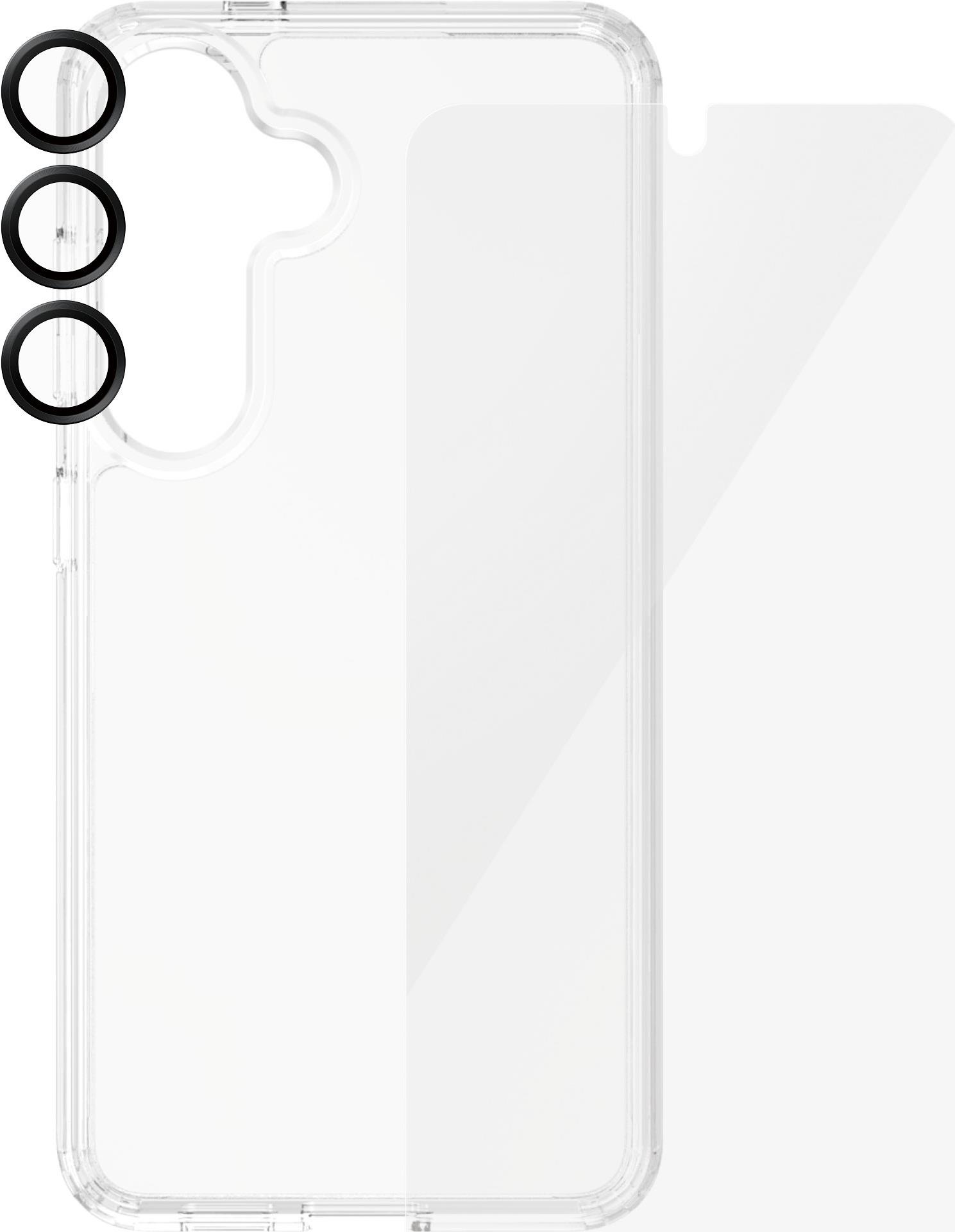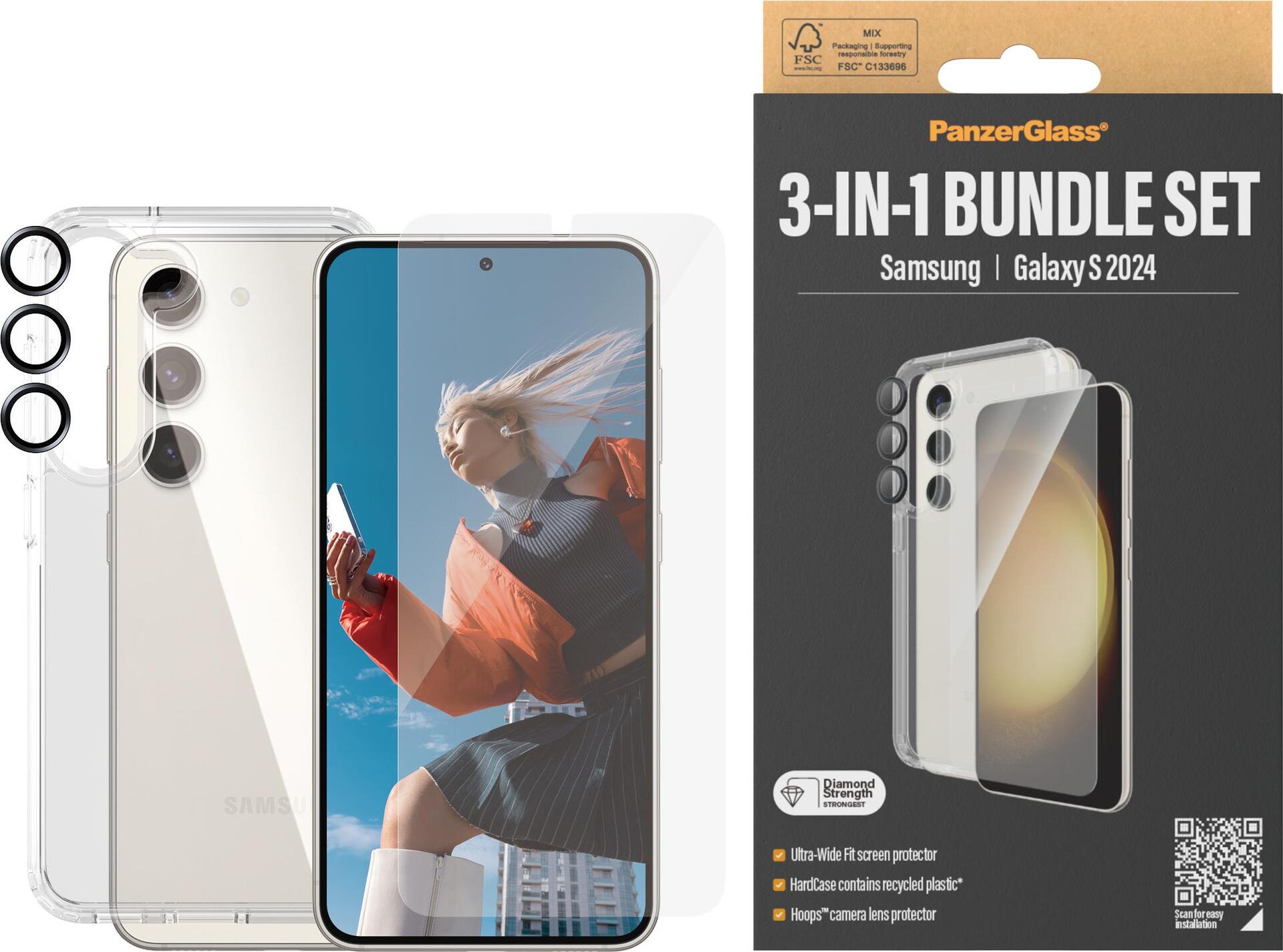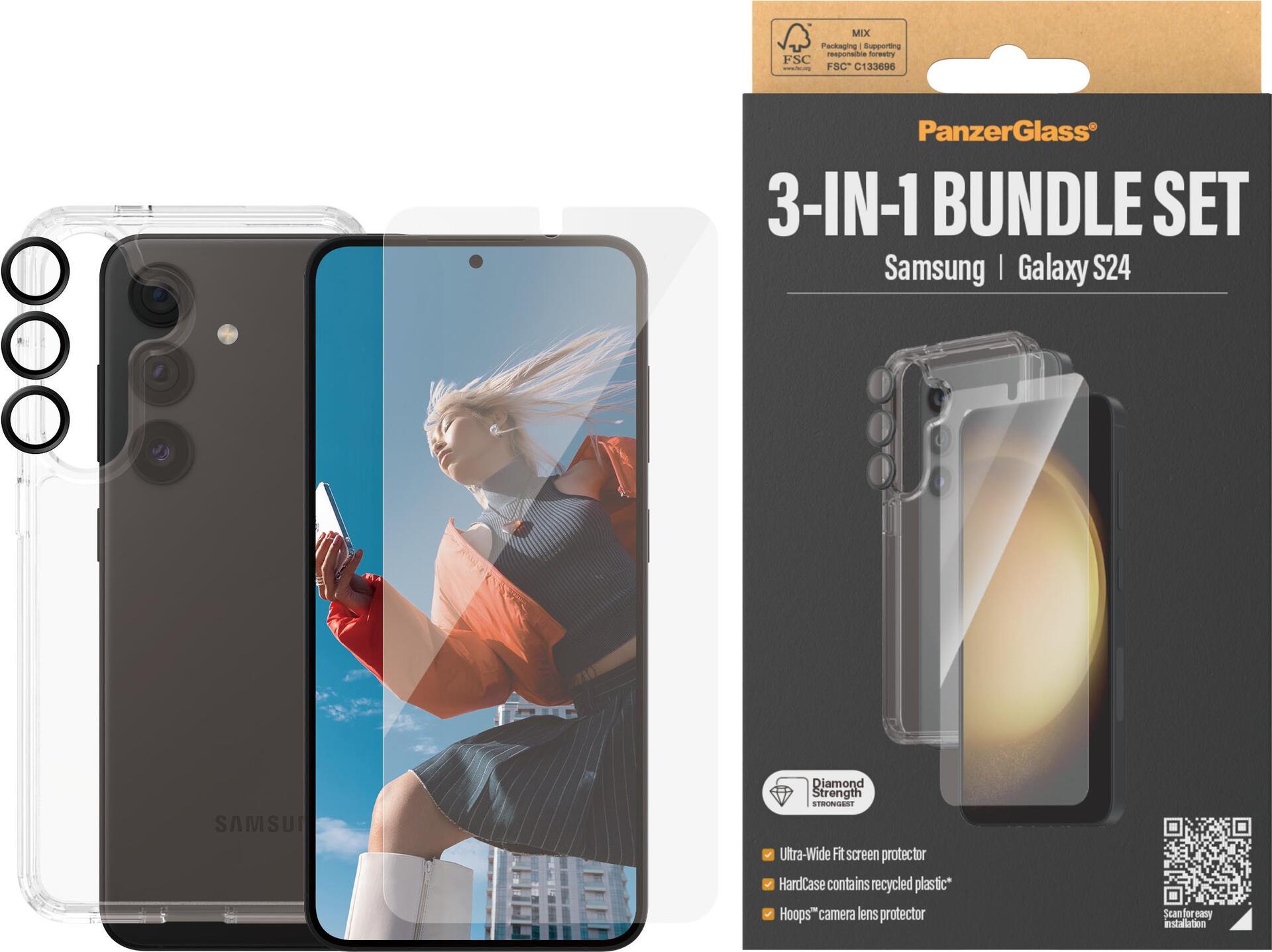 PanzerGlass - 3-in-1 Schutzpacket - hintere Abdeckung für Mobiltelefon - ultraweite Passform mit EasyAligner - D3O Bio, Polyethylenterephthalat (PET), recycelter Kunststoff - mit Bildschirmschutz und Objektivschutz - für Samsung Galaxy S24 (B1213+7350)