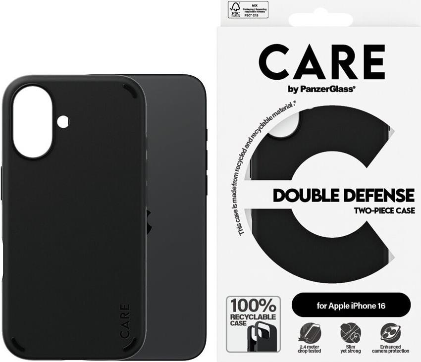 Die CARE by PanzerGlass Double Defense wurde entwickelt, um Ihr Mobiltelefon mit seinen robusten Eigenschaften zu schützen. Hergestellt aus einer Kombination aus thermoplastischem Polyurethan und Polycarbonat, bietet diese Schutzhülle Haltbarkeit und ein schlankes Profil, das bequem in der Hand liegt. Die Hülle unterstützt kabelloses Aufladen und sorgt dafür, dass der Komfort nicht beeinträchtigt wird, während Ihr Gerät vor Kratzern und Stürzen aus bis zu 4,8 m Höhe geschützt ist. Mit ihrem zweiteiligen Design bietet diese Hülle Schutz vor Stürzen und Stößen und entspricht den FSC-Standards, da sie vollständig aus recyceltem Kunststoff hergestellt wird, was eine Verpflichtung zur Nachhaltigkeit widerspiegelt.