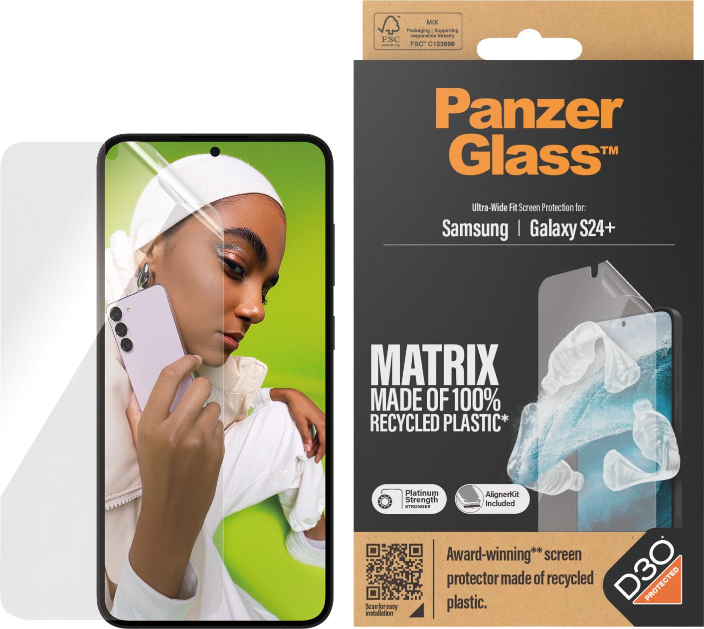 Det er tid til forandring, og den prisvindende MATRIX skærmbeskytter fra PanzerGlass™ ER forandring: MATRIX er lavet af 100 % genanvendt plast. Den er udviklet til at forlænge levetiden på din telefon. Den leveres i en genanvendelig FSC™-mærket æske. Den bruger cirka 30 %* mindre papiremballage end tidligere MATRIX modeller. Den er lavet med beskyttelsesmaterialet D3O®, der blandt andet bruges af militære elitestyrker og professionelle atleter. Og så holder den alt fra ridser og revner til slag og stød på sikker afstand af din skærm. Skærmbeskytteren kan forlænge levetiden på din telefon, så du måske en dag kan give den videre til en anden, som vil elske den lige så højt som dig. Det er ren telefonkærlighed – og én måde at bidrage til mere bæredygtig fremtid på. En anden er passe bedre på verdens dyreliv. For at styrke den indsats har PanzerGlass™ valgt at støtte nonprofitorganisationen The Perfect World Foundations “Project Oceans”. For hver solgt MATRIX donerer vi et beløb til projektet, der arbejder for at beskytte dyrelivet i verdenshavene, blandt andet ved at reducere den mængde af plast og ”ghost nets”, der ender i havene. Sammen med den her skærmbeskyttelse får du et såkaldt AlignerKit, der gør installationen så legende let, at de fleste kan gøre det i første forsøg. Og ellers følger du bare trin-for-trin-guiden eller scanner QR-koden til sådan-installerer-du-videoen. Skærmbeskyttelsen er så ultratynd, at du nærmest ikke lægger mærke til den, men når den først sidder på telefonen, er det slut med at frygte lyden af glas mod skarpe kanter og hårde overflader. Det kommer muligvis aldrig til at ske, men hvis det gør, vil du fortryde, at du ikke klikkede ”Tilføj til kurv”. Skærmbeskytteren har størrelsen “Ultra-Wide Fit”. Det betyder, at den dækker fronten af din telefon, samtidig med at den giver dig en fuldendt skærmoplevelse og efterlader lidt plads langs kanterne til en case. Vil du give din telefon 360-graders beskyttelse, kan du kombinere skærmbeskytteren med en PanzerGlass™ case og en PanzerGlass™ PicturePerfect kameralinsebeskytter. *Målt ved at sammenligne massen af ??2023 papemballage med massen af ??2022 papemballage. Målinger udført af tredjeparts laboratorium (CPRTC, rapport nr. ZSA20231301-0016).Hauptmerkmale