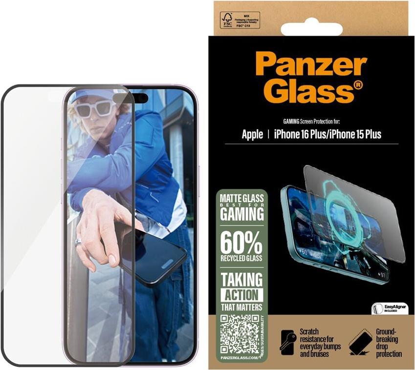 PanzerGlass Gaming - Bildschirmschutz für Handy - ultrabreite Passform - Glas - Rahmenfarbe schwarz - für Apple iPhone 15 Plus, 16 Plus (2859)