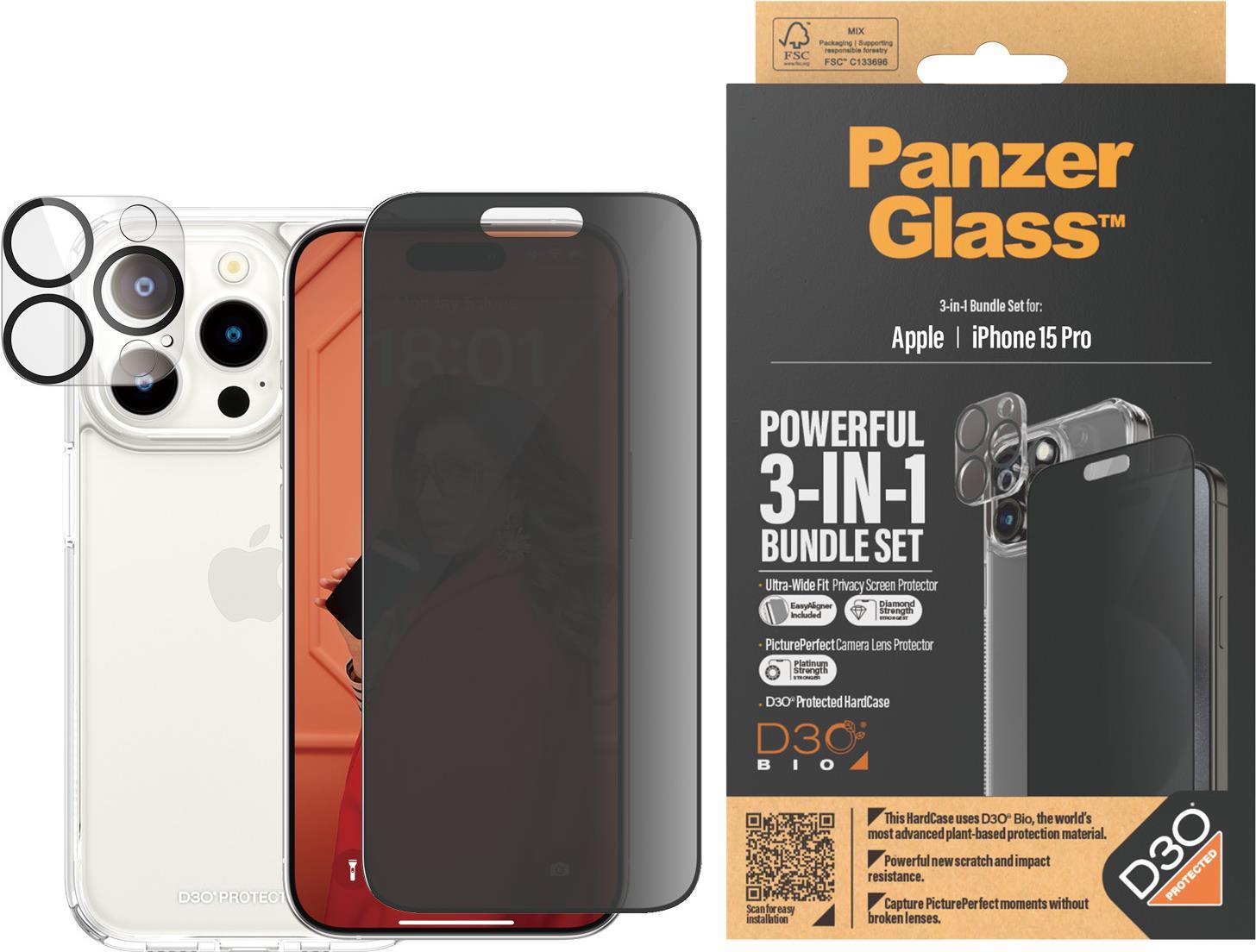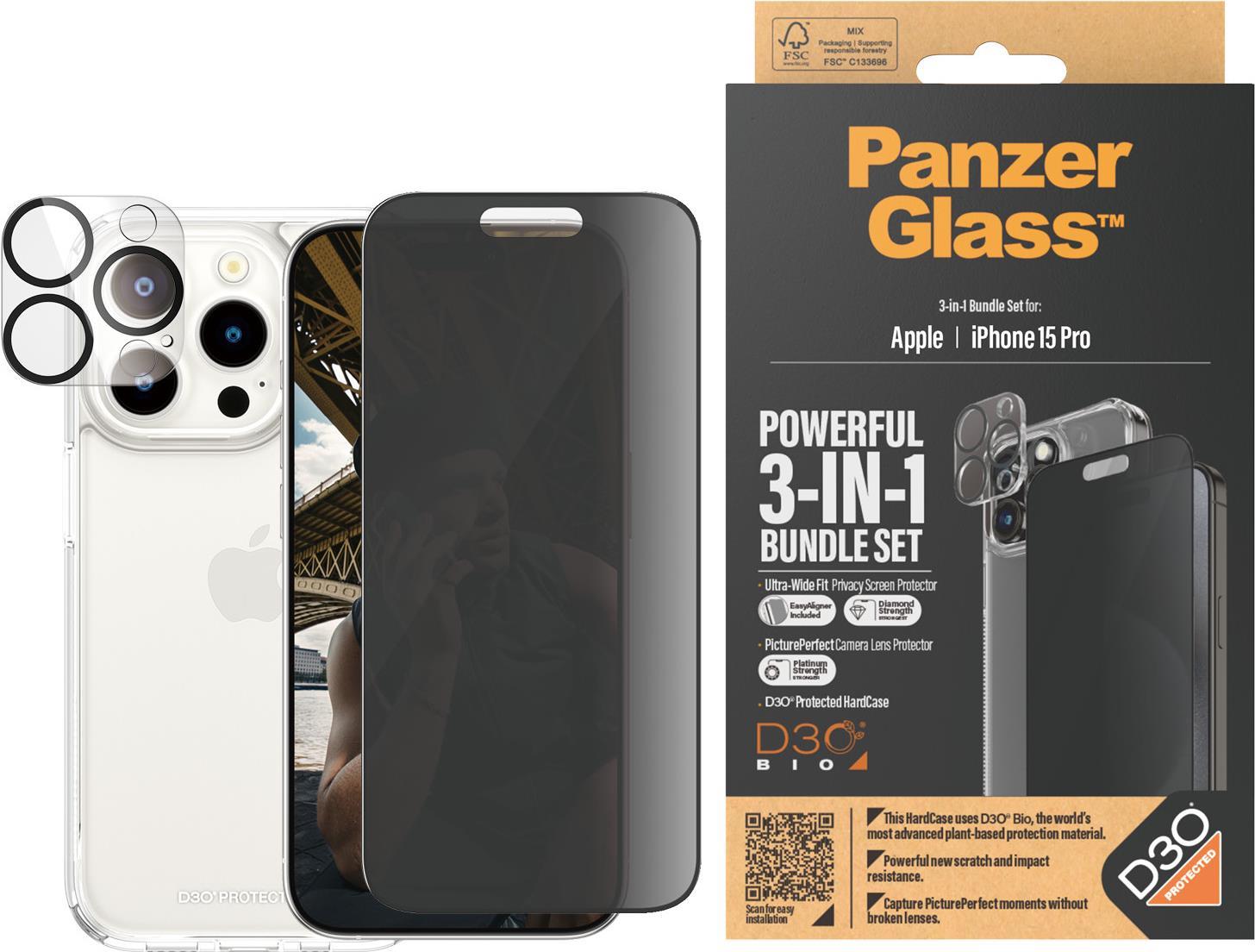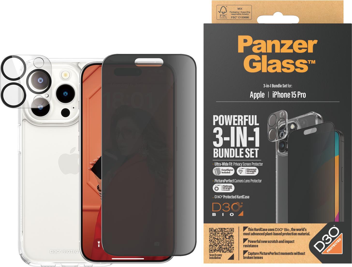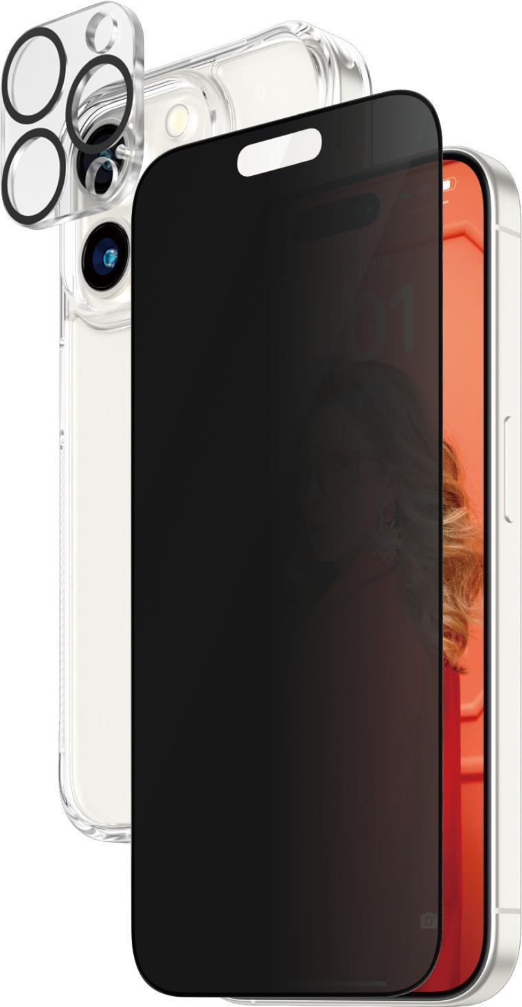 PanzerGlass Privacy - 3-in-1 Pack - Schutzkit für Display / Objektiv / Rückseite für Handy - Glas - mit Sichtschutzfilter - Rahmenfarbe schwarz - für Apple iPhone 15 Pro (B1173+P2810)