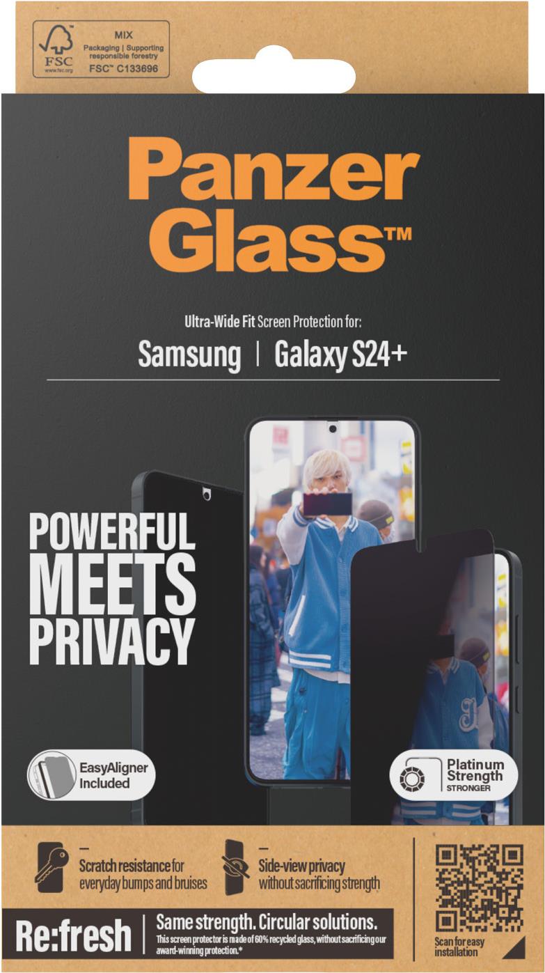 PanzerGlass - Bildschirmschutz für Handy - Ultra-Wide Fit mit EasyAligner - Glas - mit Sichtschutzfilter - Rahmenfarbe schwarz - für Samsung Galaxy S24+ (P7351)