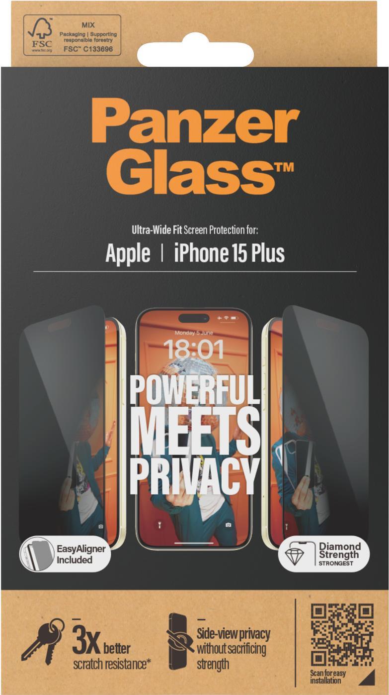 PanzerGlass - Bildschirmschutz für Handy - ultrabreite Passform - Glas - mit Sichtschutzfilter - 6,7" - Rahmenfarbe schwarz (Packung mit 10) - für Apple iPhone 15 Plus (P2811)