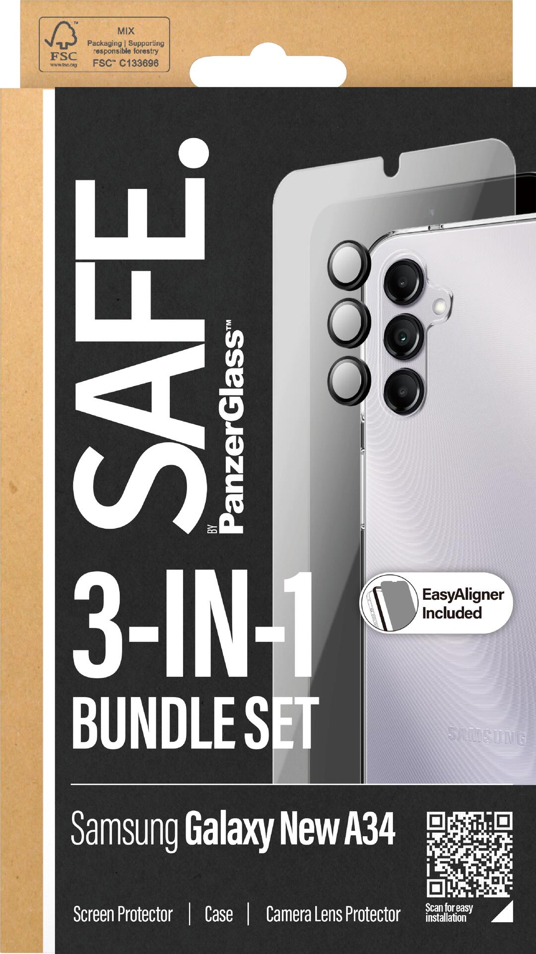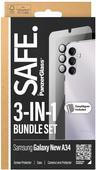 PanzerGlass SAFE. by ® 3-in-1 Schutz Set Samsung Galaxy New A34 5G. Markenkompatibilität: Samsung, Kompatibilität: Samsung - Galaxy new A34 5G. Trockene Anwendung. Schutzfunktion: Kratzresistent, Schockresistent. Material: Polyethylenterephthalat, Gehärtetes Glas, Produktfarbe: Transparent. Menge pro Packung: 1 Stück(e) (BSAFE95690)