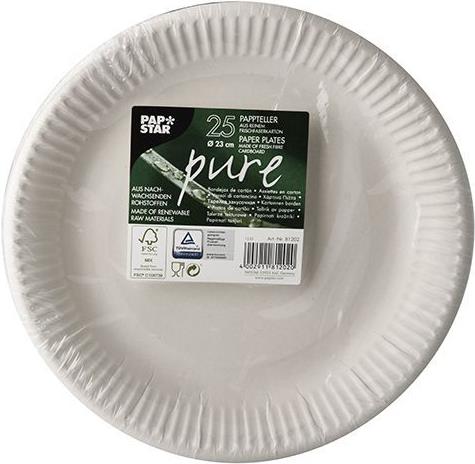 PAPSTAR Papp-Teller "pure", rund, 230 mm, weiß, 25er aus 100% Frischfaserkarton, lebensmittelecht, kompostierbar - 1 Stück (81202)