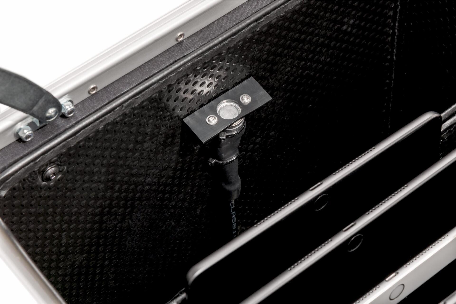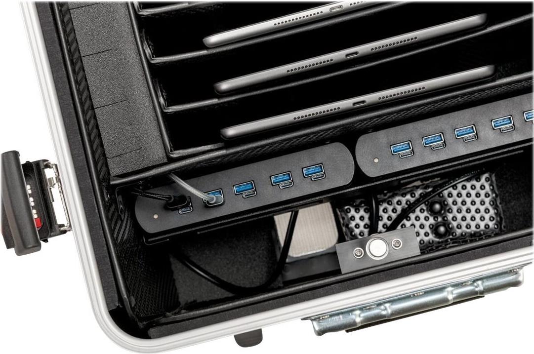 Der PARAPROJECT Case TC10 dient zum Laden, Transportieren und Aufbewahren von 10 Tablets mit einer Größe bis zu 12,9". Der Case verfügt über innovative TwinCharge Module, mit denen zeitgleich bis zu zehn Endgeräte mit USB-A oder USB-C -Anschluss geladen werden. Die intelligenten TwinCharge Module verfügen zudem über eine automatische Anpassung der Ladeleistung durch USB-PD (Power Delivery) und laden nach den QuickCharge Standards. Somit sind die Tablets in kürzester Zeit wieder einsatzfähig. Die schwarze aus X-ABS Kunststoff verarbeitete Kofferschale ist extrem robust und schützt vor äußeren Einflüssen. Ein integrierter Überspannungsschutz sowie ein Temperatursensor geben zusätzliche Sicherheit im täglichen Einsatz. Lüftungsöffnungen in Deckel und Boden sorgen für optimale Luftzirkulation. Dank seiner Leichtlaufräder, der stabilen, beidseitigen Tragegriffe und des 4-fachen Teleskopauszugs lässt er sich bequem wie ein Trolley nutzen und transportieren. Die Ladefunktion lässt sich bequem durch den außen integrierten Hauptschalter ein- bzw. ausschalten. Der PARAPROJECT Case TC10 verbindet ergonomisches Design mit Funktionalität und Geräteschutz und ist vor allem im Bildungssektor ein unverzichtbarer Helfer.