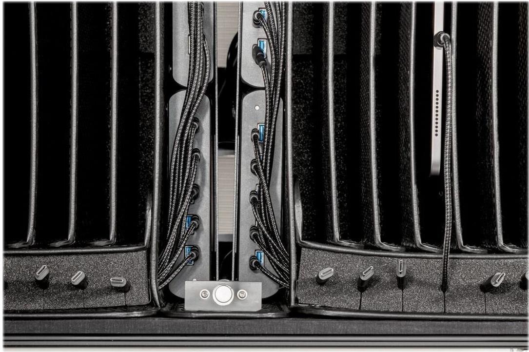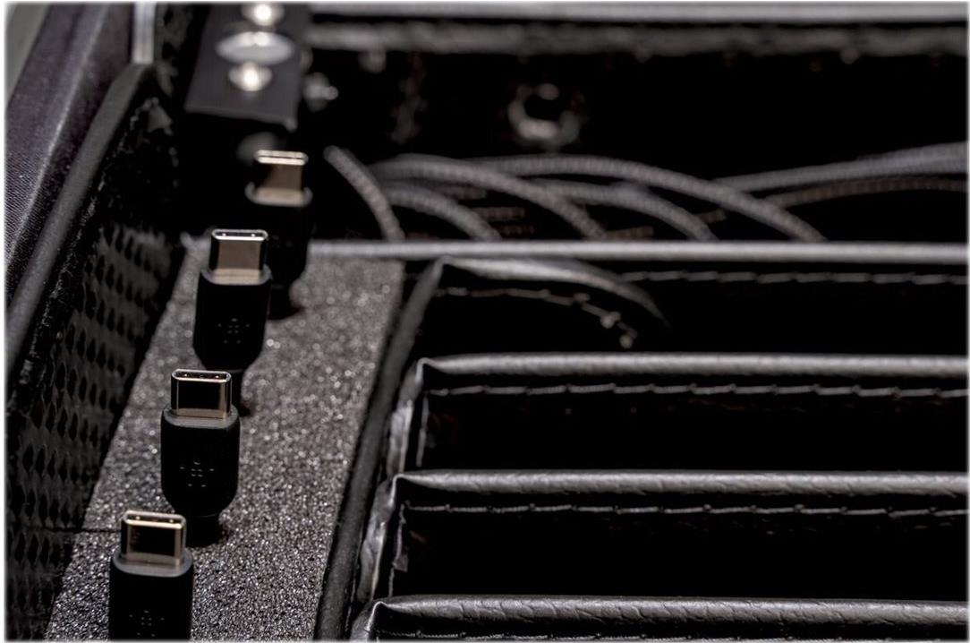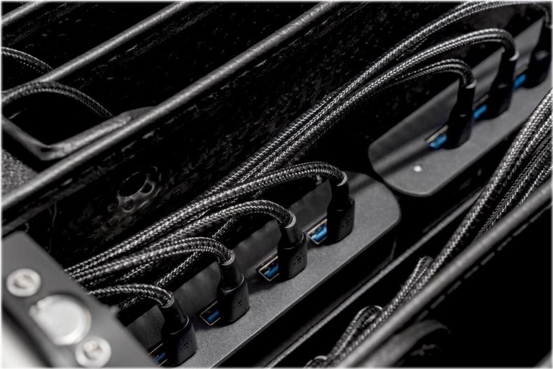 Besonders praktisch sind die verschiedenen Fächer und Taschen für Kleinteile und sonstiges Zubehör, die im Kofferdeckel eingearbeitet sind. Damit die Luft im Case optimal zirkulieren kann, sind im Deckel und Boden mehrere Lüftungsöffnungen integriert. Zudem ausgestattet mit vier Leichtlaufrädern, davon zwei mit Radfeststellern, zwei seitlichen Tragegriffen und einem 4-fach Teleskopauszugs steht einem bequemen und sicheren Handling nichts im Weg. Im Case sind 20 Original Belkin Smart-USB-C-Kabel mit Boost Charge und Nylon-Verstärkung vorinstalliert.