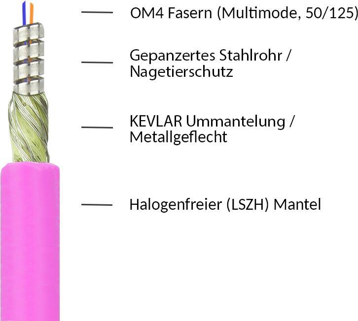 Im Vergleich zu Standard LWL Patchkabel sind diese Kabel zusätzlich durch ein flexibles und gepanzertes Stahlrohr sowie Kevlar-Litzen und ein Metallgeflecht geschützt. Durch diesen hochwertigen und robusten Kabelaufbau ist das Kabel trittfest, bietet Schutz vor Nagetieren und kommt überall zum Einsatz, wo es auf höchste Zuverlässigkeit ankommt.
