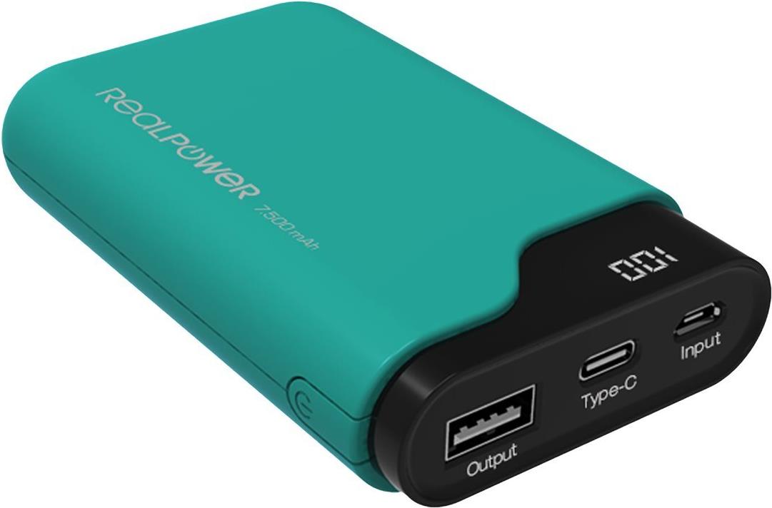 Realpower PB-7500C - Ladegerät 7500 mAh 27 Wh - 2.1 A - 2 Ausgabeanschlussstellen (USB, USB-C) - auf Kabel: Micro-USB, USB-C - grün