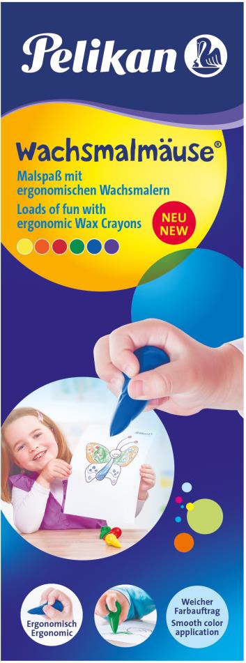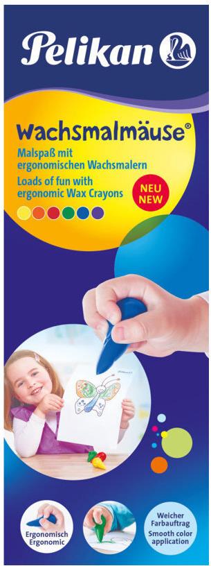 Kindgerechte Wachsmalstifte in Mäuseform in 6 Farben (Blau, Rot, Violett, Grün, Gelb, Orange). Weicher Farbauftrag und kein Abfärben an den Händen. Unterstützt den Pfötchengriffs – wichtig für die Vorbereitung zum Schreiben.