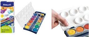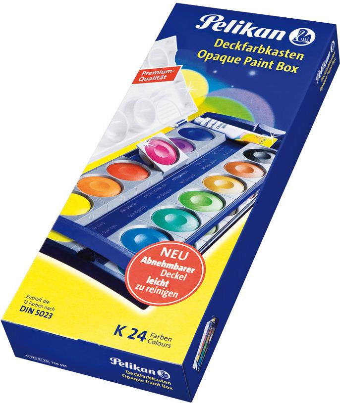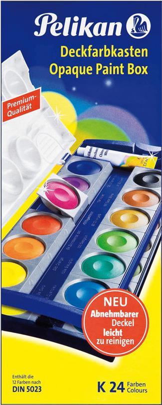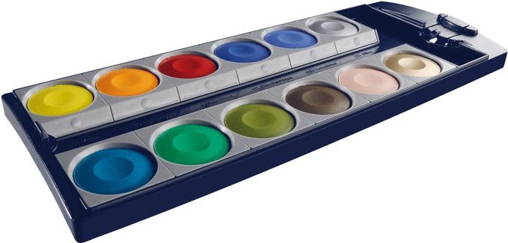 Dieses Produkt ist ein Deckfarbkasten 735K/24 mit Farbschälchen und abnehmbarem Deckel mit großen Mischtöpfen.