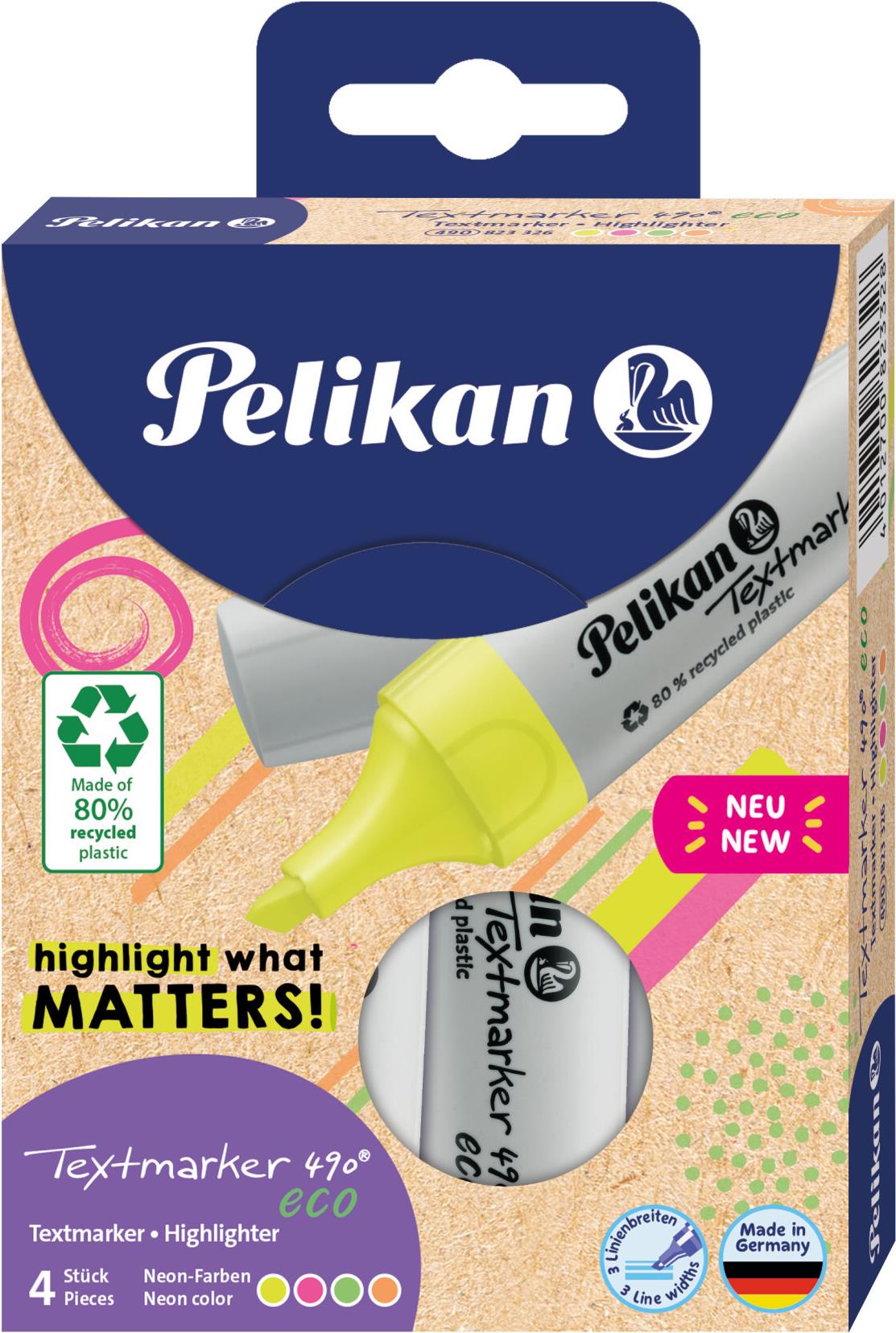 Pelikan Textmarker 490 eco. Menge pro Packung: 4 Stück(e), Schreibfarben: Grün, Orange, Pink, Gelb, Typ der Spitze: Meißel. Verpackungsart: Karton mit Aufhänger (823326)
