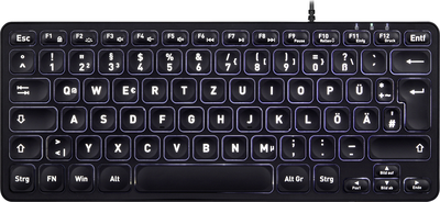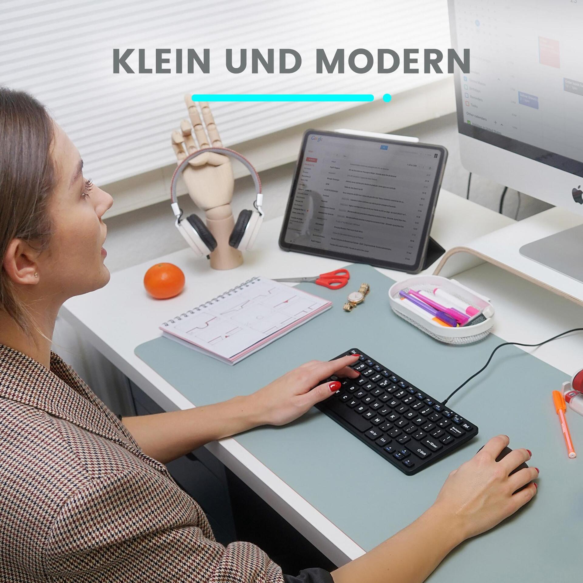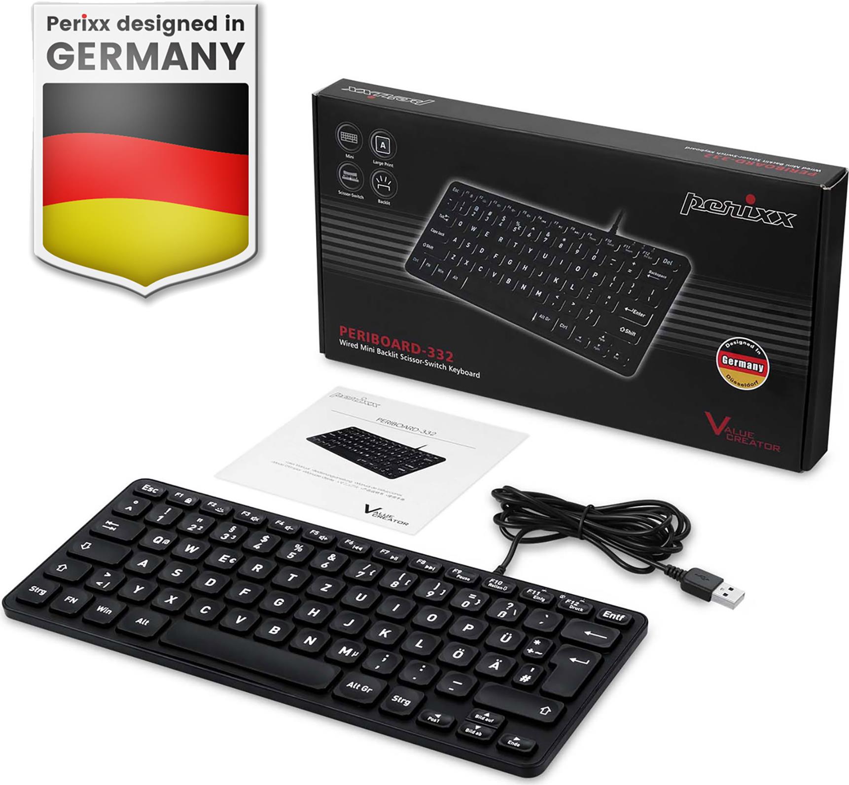 • Perixx PERIBOARD-332B. Tastatur Formfaktor: Mini, Geräteschnittstelle: USB, Tastatur-Key Switch: Scherenschlüsselschalter, Tastaturaufbau: QWERTZ. Typ der Hintergrundbeleuchtung: LED. Kabellänge: 1,8 m. Empfohlene Nutzung: Universal. Produktfarbe: Schwarz (57155F)