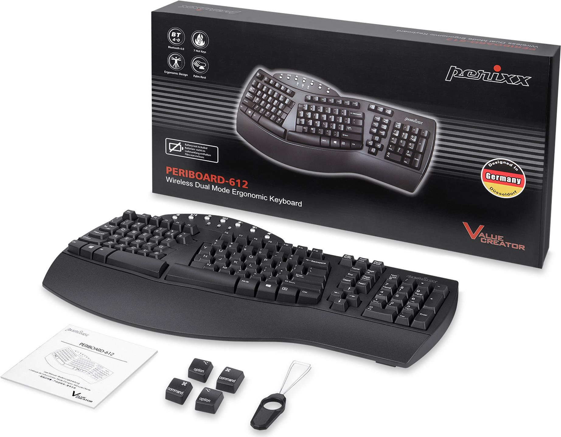 Perixx PERIBOARD-612BDE Bluetooth® Tastatur Deutsch, QWERTZ Schwarz Ergonomisch, Handballenauflage, Multimediatasten (11353)