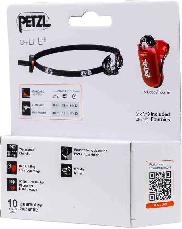Die ultraleichte, sehr kompakte e+LITE Stirnlampe für Notfallsituationen findet in jeder Tasche Platz. In ihrem Schutzetui kann die stets betriebsbereite Lampe problemlos zehn Jahre lang inklusive Batterien in einem Rucksack, einer Jackentasche, einer Notfalltasche oder als Behelfslampe aufbewahrt werden. Sie verfügt über ein Dauer- oder Blinklicht von 30 Lumen, um zu sehen und gesehen zu werden. Die in das elastische Kopfband der Stirnlampe integrierte Signalpfeife ermöglicht es dem Benutzer, in Notfallsituationen auf sich aufmerksam zu machen. Mit ihren 26 Gramm ist die e+LITE die ideale Lampe für den Notfall.