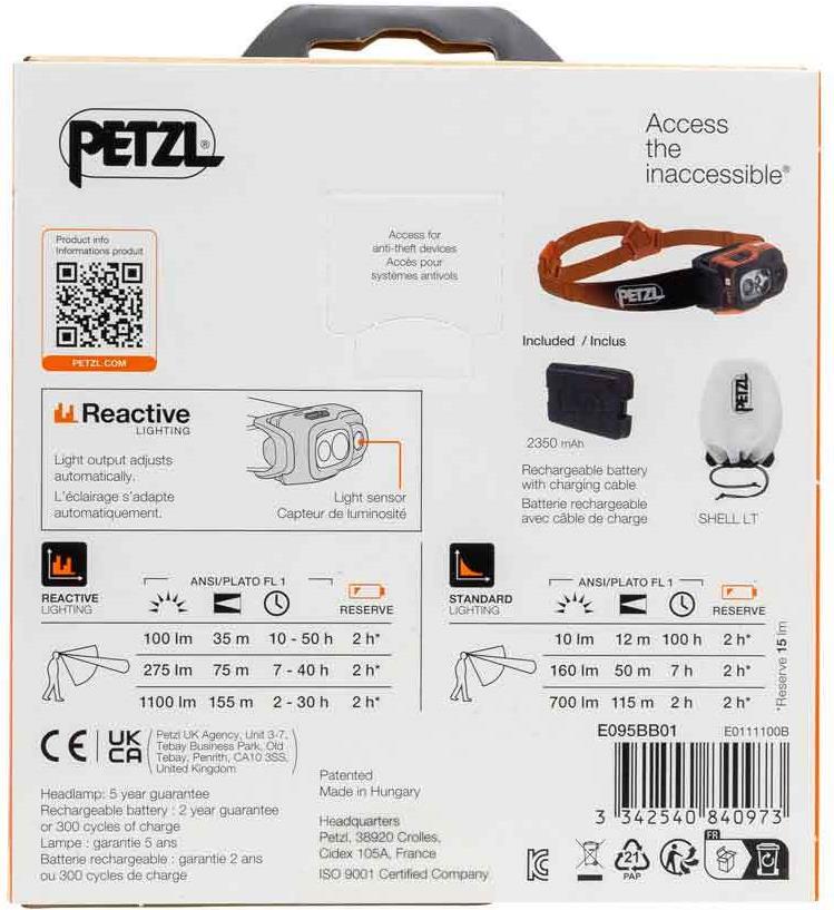 • Petzl SWIFT RL. Taschenlampen Typ: Stirnband-Taschenlampe, Produktfarbe: Schwarz, Orange, Weiß, Steuerung: Tasten. Zertifizierung: CE, UKCA. Lampentyp: LED, Lichtleistung: 1100 lm, Lichtstrahl-Entfernung (max.): 155 m. Aufladequelle: USB, Akku-/Batterietyp: Integrierte Batterie, Akku-/Batterietechnologie: Lithium-Ion (Li-Ion). Gewicht: 100 g (E095BB01)