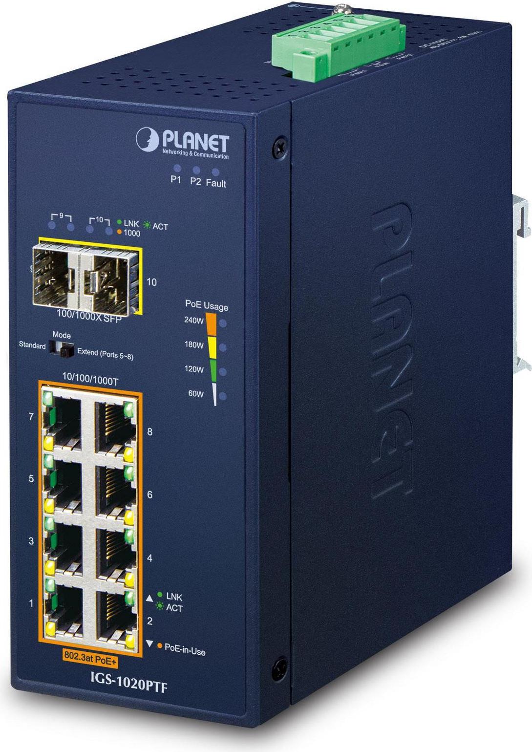 Der PLANET IGS-1020PTF ist ein industrietauglicher Unmanaged Gigabit Ethernet PoE+ Switch auf DIN-Schiene mit acht 10/100/1000BASE-T Ports mit IEEE 802.3at PoE+ und zwei 100/1000BASE-X Glasfaserschnittstellen für Uplink-Verbindungen.