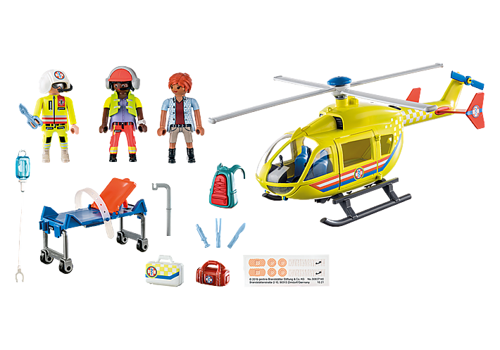 1 Rettungspilot, 1 Rettungscopilotin, 1 Verletzte; Zubehör: 1 Rettungshelikopter, 1 Krankentransportliege, 1 Inm. Infusionsschlauch, 1 Set Erste Hilfe Instrumente, 1 Rucksack, 1 Verbandstasche, 1 Verbandskoffer, 1 Etikettenbogen mit Verbandmaterial, 1 Helm m. Mikrofon, 1 Schirmmütze, 1 Kopfhörer, 1 Armbanduhr |