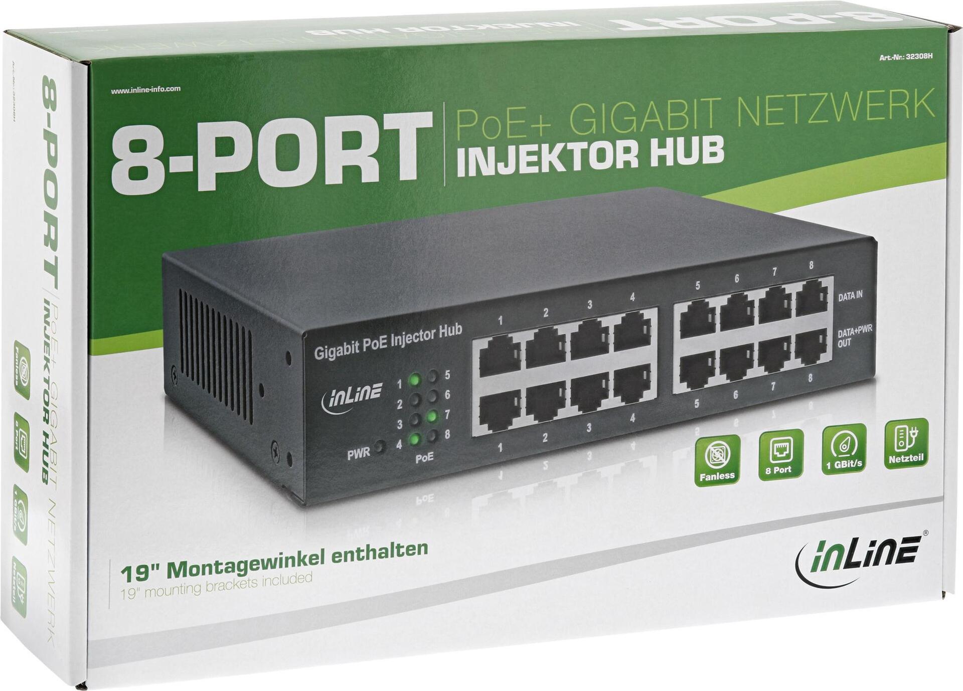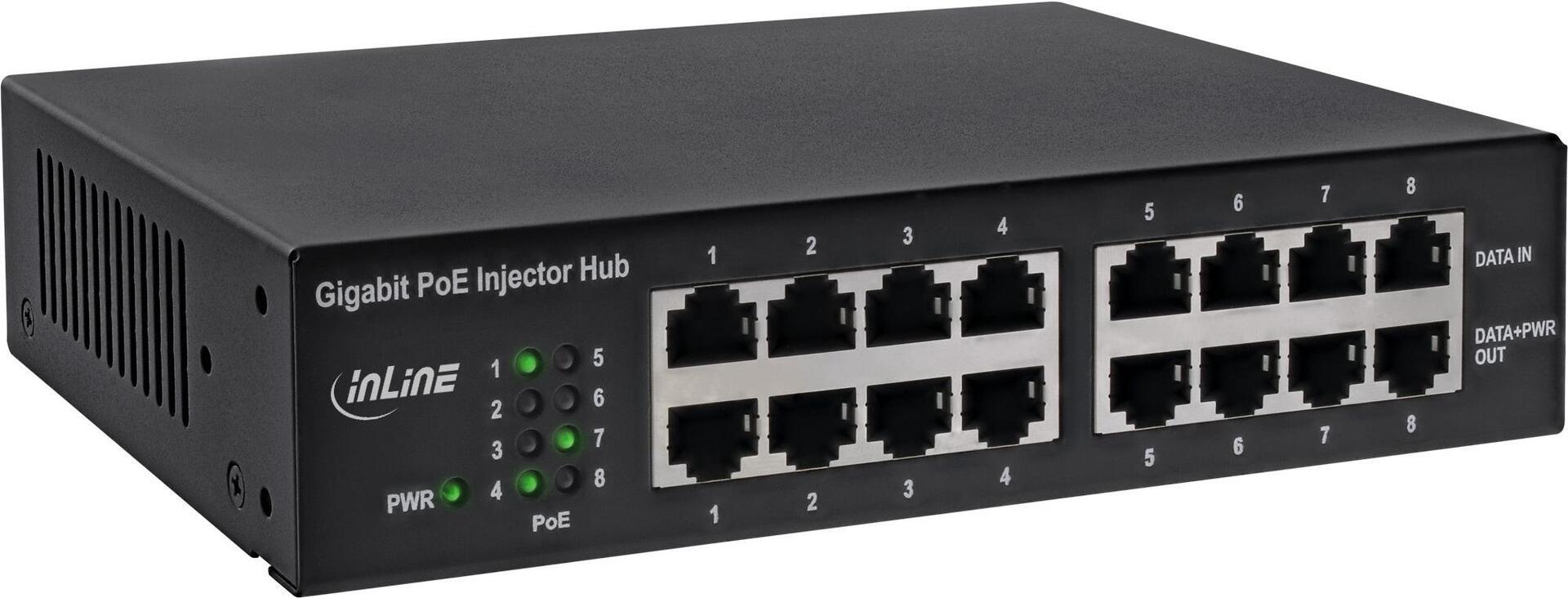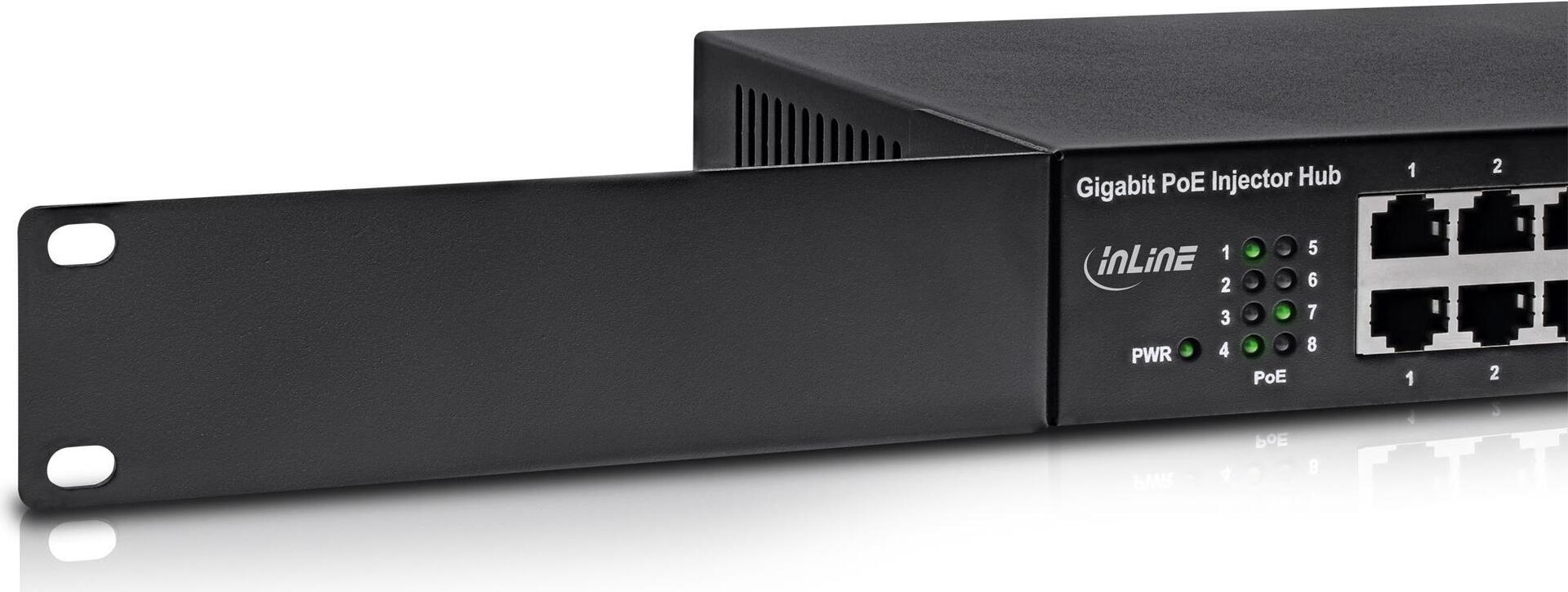 INLINE PoE+ Gigabit Network Injector Hub - Switch - 8 Anschlüsse - an Rack montierbar |