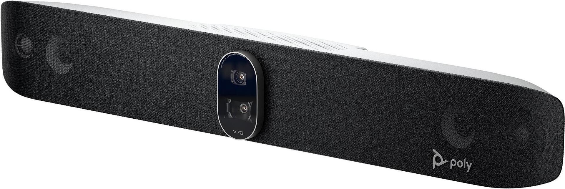 Mit der Premium-USB-Videobar Poly Studio V72 erreichen Sie eine tiefere Ebene der Zusammenarbeit in großen Räumen. Sie ist anwenderfreundlich und skalierbar, für PC-basierte Räume optimiert, verfügt über Poly DirectorAI und NoiseBlockAI-Technologie und bietet zertifizierte Kompatibilität mit allen gängen Cloud-Videoplattformen.